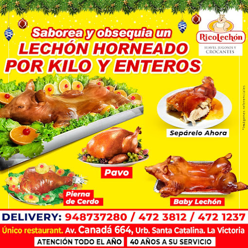 En esta fiesta navideña queremos estar presente en su mesa, compartiendo esos momentos inolvidables de sabor y tradición característica de toda buena familia peruana, ofreciéndoles nuestras mas sabrosas especialidades: Lechones Horneados, Jugosas Piernas de Cerdo y los riquísimos Pavos Horneados ; ideal para disfrutar en toda ocasión: Navidad, Año Nuevo, Día de la Madre, Día del Padre, Matrimonios, Aniversarios de Empresas, Cumpleaños, Eventos, etc.