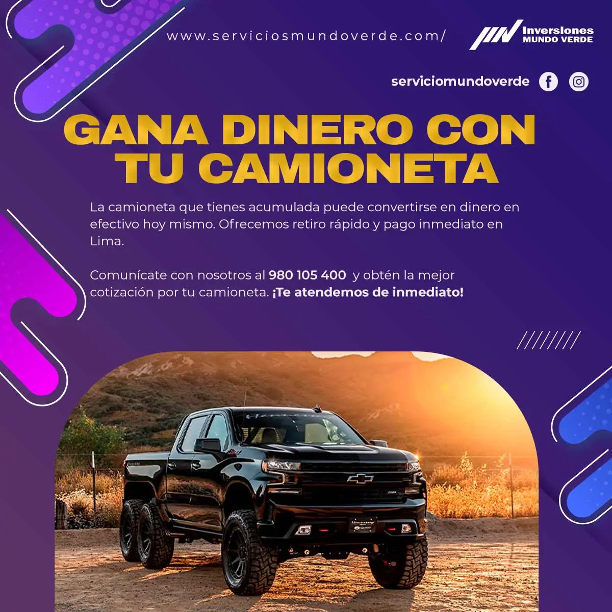 ¡Compramos tu camioneta en cualquier estado! ¿Tienes una camioneta en desuso, chocada o simplemente quieres venderla rápido? ¡Nosotros la compramos! Aceptamos camionetas en cualquier condición, con pago inmediato y sin trámites complicados. Camionetas en uso o fuera de funcionamiento Compra rápida y segura Pago justo al instante Contáctanos hoy: 980105400