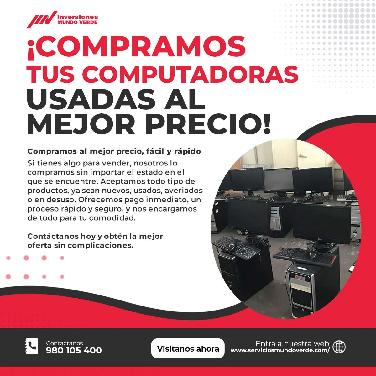 ¿Tienes computadoras en desuso ocupando espacio? ¡Nosotros las compramos! Funcionen o no, les damos una segunda vida a través de un reciclaje responsable. Operamos en toda Lima, ayudándote a liberar espacio y ganar dinero de manera rápida y sencilla. Contáctanos: 980105400 y dale un nuevo valor a tus equipos.