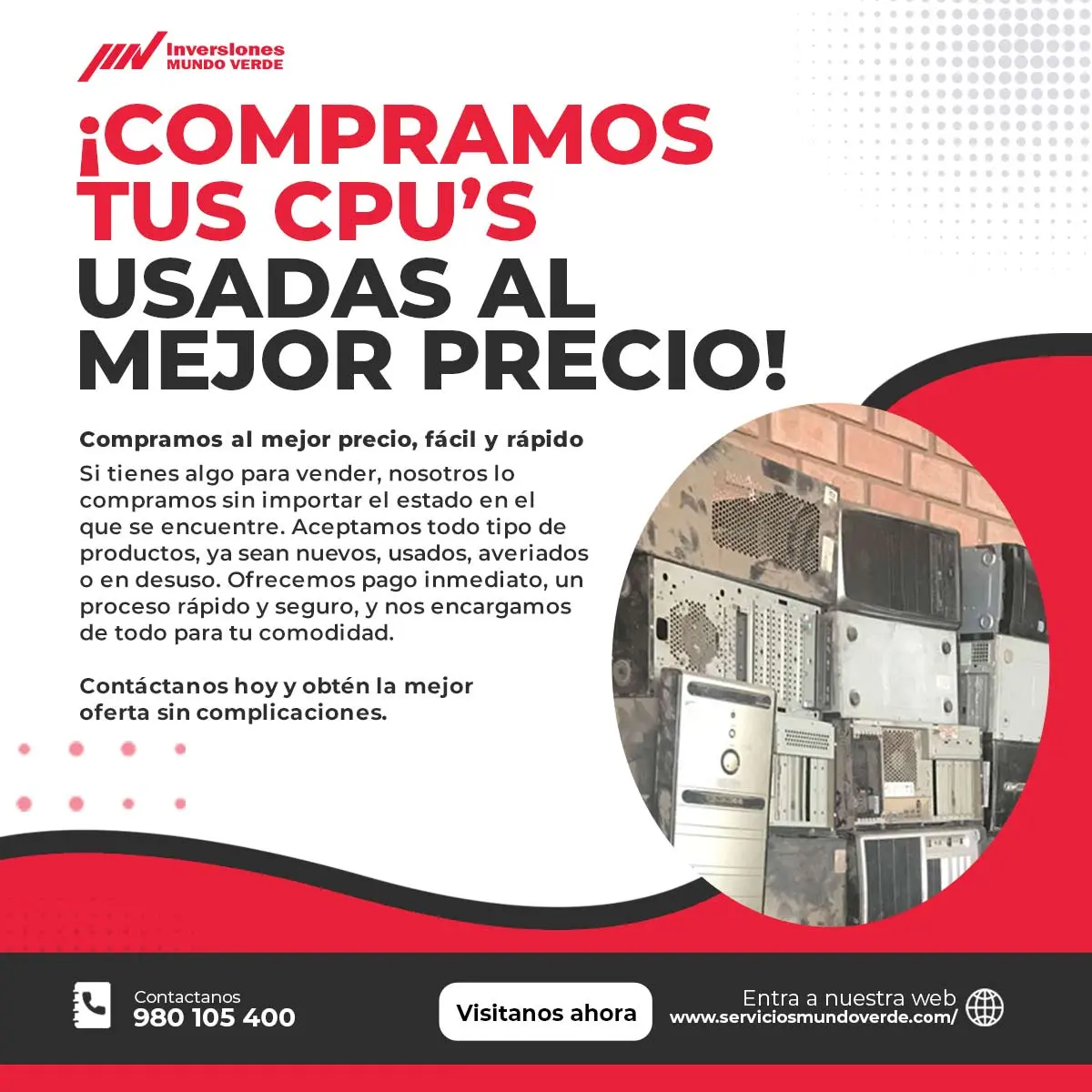 ¿Tienes cpus en desuso ocupando espacio? ¡Nosotros las compramos! Funcionen o no, les damos una segunda vida a través de un reciclaje responsable. Operamos en toda Lima, ayudándote a liberar espacio y ganar dinero de manera rápida y sencilla. Contáctanos: 980105400 y dale un nuevo valor a tus equipos.