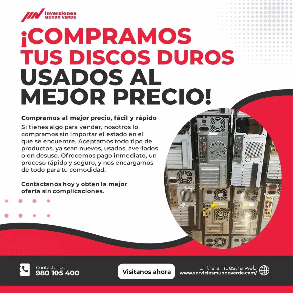 ¿Tienes discos duros en desuso ocupando espacio? ¡Nosotros las compramos! Funcionen o no, les damos una segunda vida a través de un reciclaje responsable. Operamos en toda Lima, ayudándote a liberar espacio y ganar dinero de manera rápida y sencilla. Contáctanos: 980105400 y dale un nuevo valor a tus equipos.