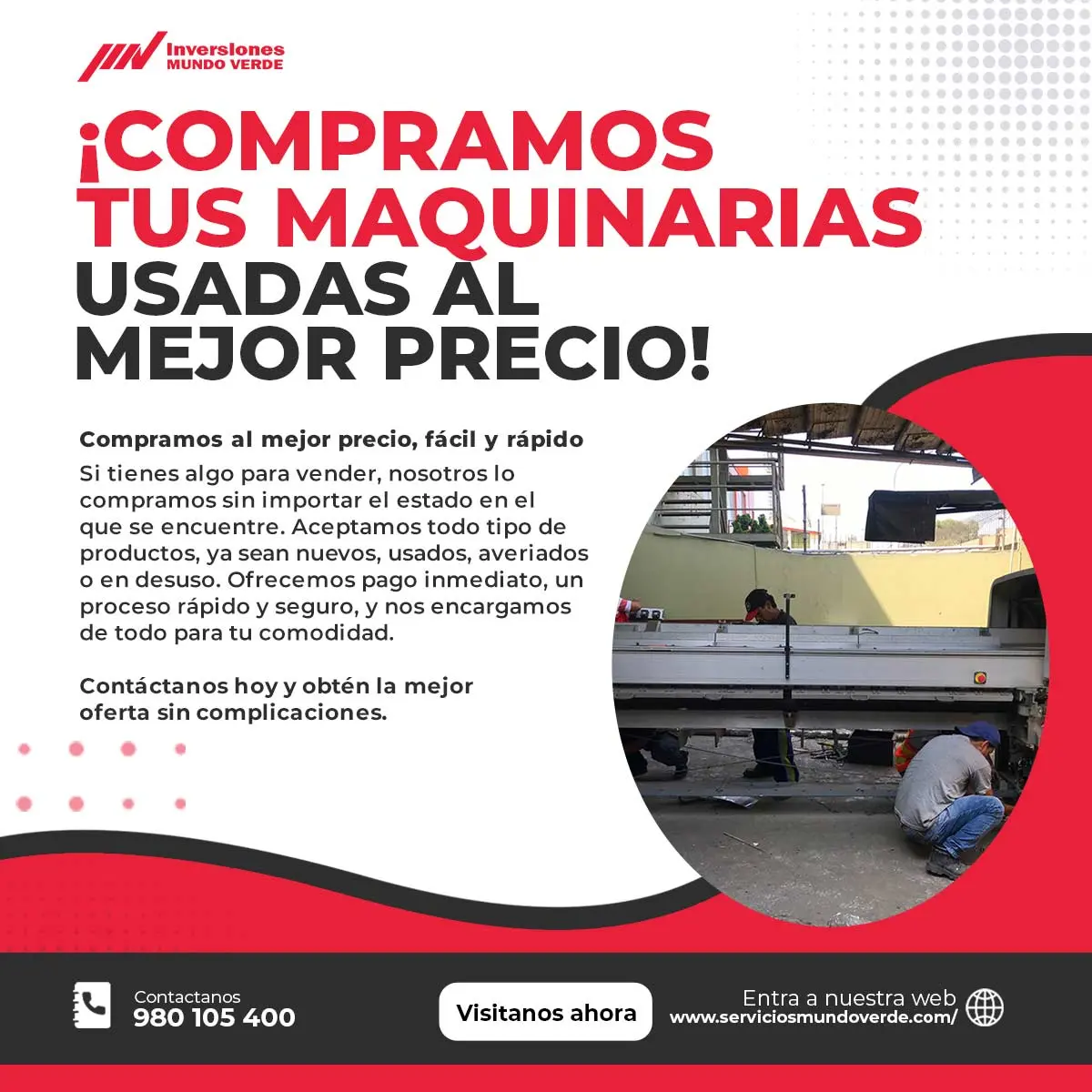 ¿Tienes maquinarias en desuso ocupando espacio? ¡Nosotros las compramos! Funcionen o no, les damos una segunda vida a través de un reciclaje responsable. Operamos en toda Lima, ayudándote a liberar espacio y ganar dinero de manera rápida y sencilla. Contáctanos: 980105400 y dale un nuevo valor a tus equipos.