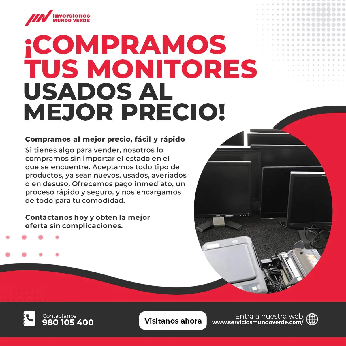 ¿Tienes monitores en desuso ocupando espacio? ¡Nosotros las compramos! Funcionen o no, les damos una segunda vida a través de un reciclaje responsable. Operamos en toda Lima, ayudándote a liberar espacio y ganar dinero de manera rápida y sencilla. Contáctanos: 980105400 y dale un nuevo valor a tus equipos.
