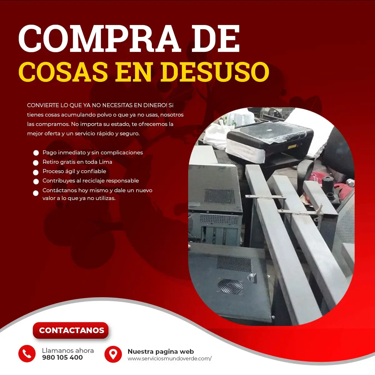 ¿Tienes cosas en desuso en desuso acumulando polvo? Nosotros las compramos, ya sea que estén en uso o fuera de funcionamiento. Ofrecemos una solución de reciclaje responsable y efectiva en toda Lima, ayudándote a liberar espacio y obtener dinero rápidamente. ¡Contáctanos hoy y dale un valor renovado a tus equipos! Contactanos: 980105400