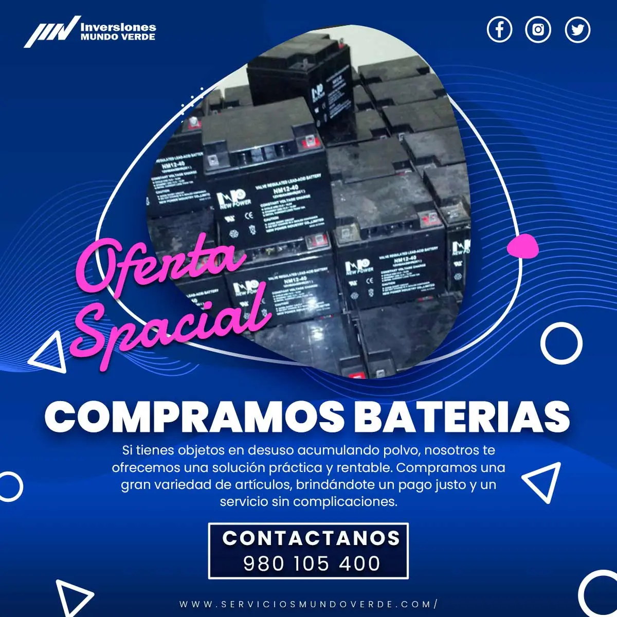 ¿Tienes baterias en desuso acumulando polvo? ¡Nosotros las compramos! Ya sea que aún funcionen o estén fuera de servicio, te ofrecemos una solución de reciclaje responsable y efectiva en toda Lima. Libera espacio, ayuda al medio ambiente y recibe dinero por tus equipos de manera rápida y segura. Contáctanos hoy mismo: 980105400
