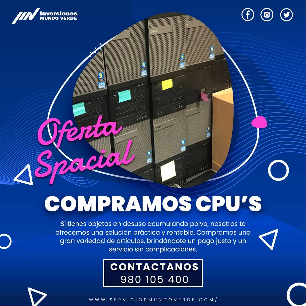 ¿Tienes cpu en desuso acumulando polvo? ¡Nosotros las compramos! Ya sea que aún funcionen o estén fuera de servicio, te ofrecemos una solución de reciclaje responsable y efectiva en toda Lima. Libera espacio, ayuda al medio ambiente y recibe dinero por tus equipos de manera rápida y segura. Contáctanos hoy mismo: 980105400