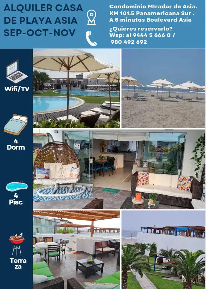 ¡ Exclusivo Condominio a 5 min del Boulevard de Asia, con acceso a Club House con 4 piscinas, canchas deportivas, sala de juegos para niños, restaurante, minimarket, guardería y seguridad 24/7 y acceso directo a la playa. : , - , . : Semana: $850 Fin de semana: $650 Mes $3100 : $1500 Lunes, 14 de abril de 2025 domingo, 20 de abril de 2025 : Derecho de alquiler al condominio: S/250 (1 a 15 días)/ S/500 1 mes Garantía: $100 (reembolsable) Precio en soles según T/C vigente