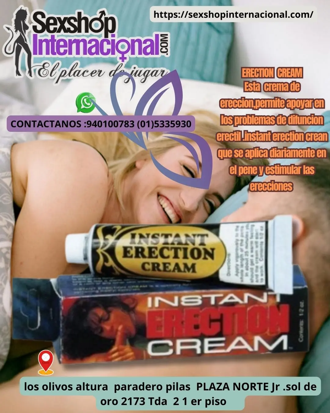 Ayuda a que las cosas funcionen! La Instant Erection Cream viene en un tubo de 0,5 onzas. 15ml Aplique una pequeña cantidad en todo el pene y frote. En 25 minutos, la crema con sabor a piña comenzará a darle una sensación de calor y vigorizar su miembro. ¡Listo en un instante! Esta crema de erección, permite apoyar en los problemas de disfucción erectil. Instant Erection Cream es una crema, que se aplica directamente en el pene para apoyar las erecciones débiles. Características: Instant Erection Cream es un producto compuesto por ingredientes puramente naturales, muy eficaces para incrementar la circulación de sangre en el pene y estimular las erecciones. Contenido: 15ml Uso y Cuidado: Los resultados dependerán del uso correcto del producto y del organismo de cada persona. Antes de usa un producto de cosmética erótica se recomienda revisar los componentes de este para evitar reacciones alérgicas. En caso de irritación suspender y consultar con su dermatólogo. SEDES: LOS OLIVOS 1 Y 2: Av Alfredo Mendiola 3849 Tienda 06 (Costado de Tambo Galería Dolaris - Frente a Metro) Jr sol de Oro 2173 Altura del Paradero Pilas (por el Mdo el Trebol Plaza Norte) PLAZA NORTE: Av Alfredo Mendiola 1929 Tda 201 Piso 2 (Frente a Plaza Norte) PUENTE PIEDRA 1 Y 2: Av Puente Piedra 241 Tienda 02 (Costado de Stanford) Av Puente Piedra 308 oficina 301 3º piso PRIMERA DE PRO: Av Alfredo Mendiola 7923 (Frente al Mdo Unicachi) MIRAFLORES: Calle Cantuarias 140 Tienda 231 segundo piso Miraflores (Altura parque Kennedy) PUCALLPA: Jr Tacna 748 Tienda 13 mall boulevard plaza TARAPOTO: Jr Jiménez Pimentel 179 Tienda 301- 3º piso (Costado de caja Huancayo) PAGINAS WEB: Sexshopinternacional.com Tiendasamor.com Nutricionsexualforte.com Fantasiasexsual.com Potenciasexualforte.com Testoultraperu.com Sextoyslima.com Anabolicrx24peru.com Anabolicrx24.com Oficialtitangel.com Alfamanperu.com Testo360peru.com