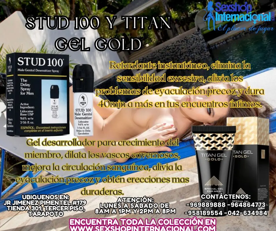 STUD100 Y TITAN GEL GOLD -Retardante instantaneo, elimina la sensibilidad excesiva, alivia los problemas de eyaculación precoz y dura 40min a más con tu pareja. -Gel desarrollador para crecimiento del miembro, dilata los vascos cavernosos, mejora la circulación sanguíneam alivia la eyaculación precoz y obten erecciones mas duraderas. Visitenos en nuestra tienda y velo por ti mismo, que no te lo cuenten. SEXSHOP INTERNACIONAL TARAPOTO Nos puede ubicar en el Jr. Jimenez Pimentel #179 Tienda -301 Tercer Piso- TARAPOTO-PERU REF:ALTURA PLAZA DE ARMAS COSTADO DE CAJA HUANCAYO Realizamos envíos a nivel nacional e internacional. https://sexshopinternacional.com/ www.sextoyslima.com www.tiendasamor.com www.fantasiasexsual.com
