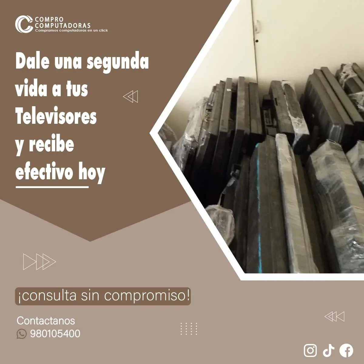 ¿Tienes televisores en desuso ocupando espacio? Nosotros los compramos, estén operativos o fuera de funcionamiento. Ofrecemos una solución de reciclaje responsable y efectiva en toda Lima, ayudándote a liberar espacio y obtener dinero rápidamente. ¡Contáctanos hoy y dale un nuevo valor a tus televisores! Contáctanos: 980105400