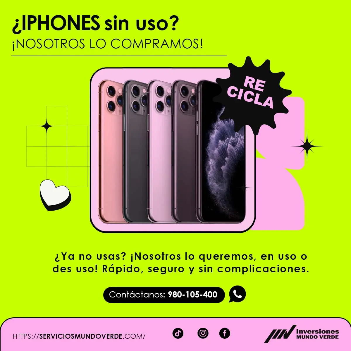¿Tienes iPhones en desuso guardados? ¡Nosotros los compramos! Ya sea que estén en funcionamiento, dañados o antiguos, te ofrecemos una solución de reciclaje responsable y efectiva en toda Lima. Libera espacio y recibe dinero al instante por esos iPhones que ya no usas. Contáctanos al 980105400 y dale un nuevo valor a tus iPhones olvidados.
