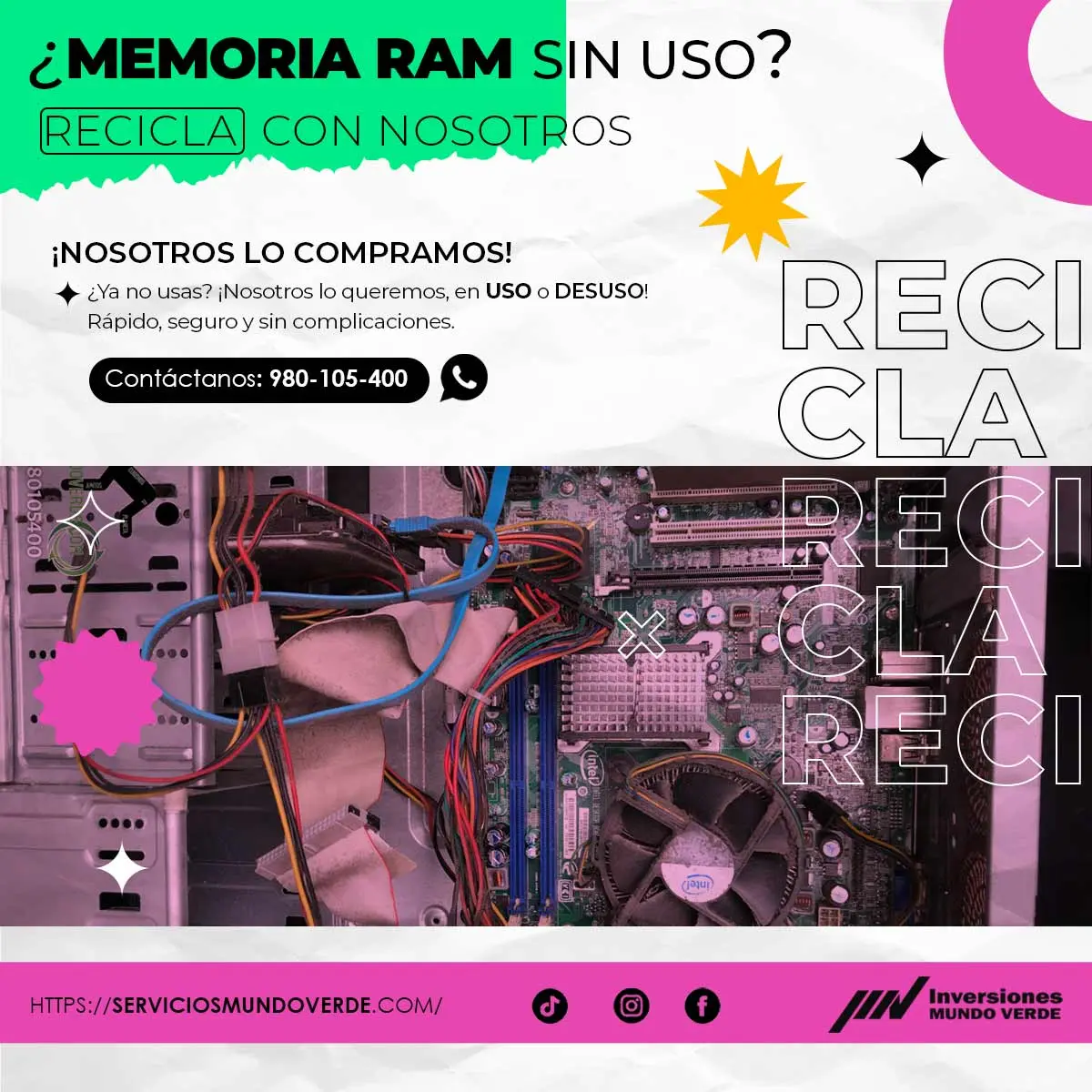 En Inversiones Mundo Verde pagamos por tu memoria RAM dada de baja, tanto en uso como en desuso. Ofrecemos recojo rápido, atención en todo Lima y compromiso con el reciclaje responsable. Contáctanos: 980105400 Visítanos: serviciosmundoverde.com