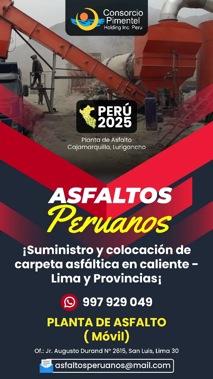 Of. Jr. Augusto Durand N° 2615, Urb. San Luis, Lima 30. Planta de Asfalto: Cajamarquilla, Lurigancho Lima. ¡¡Estamos presentes en cada pequeña y gran obra de construcción y asfaltado en el Perú 2026.¡¡¡¡¡