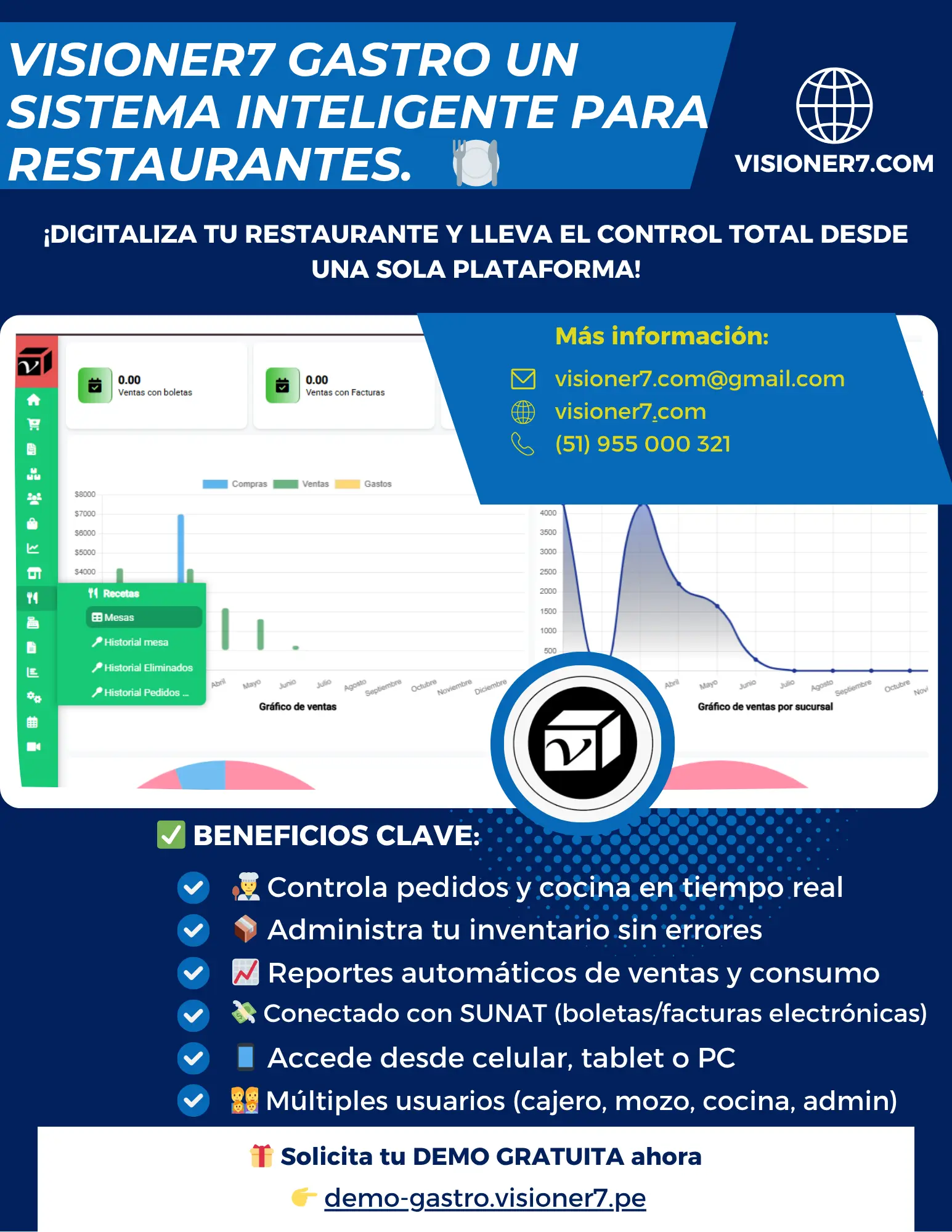 ¿Tienes un restaurantee? ¡Este sistema es para ti! En Visioner7 Innova hemos desarrollado Visioner7Gastro, un sistema de gestión pensado 100% para negocios gastronómicos Estas son algunas de las funcionalidades que obtienes: App para mozos Emisión de facturas y boletas electrónicas (conexión directa a SUNAT) Control total de productos, stock, ventas y reportes Acceso desde cualquier dispositivo (100% en la nube) Gestión de empleados, turnos y mesas ¡Y mucho más! Prueba la DEMO GRATUITA aquí https://demo-gastro.visioner7.pe ¡Haz crecer tu negocio con tecnología peruana al alcance de todos! #GastroVisioner7 #RestaurantesPeruanos #SoftwareGastronómico #NegociosPerú #TransformaciónDigital #Visioner7 #DemoGratis #EmpresariosPeruanos #Cafeterías #DarkKitchen #FacturaciónSUNAT #SistemasParaRestaurantes