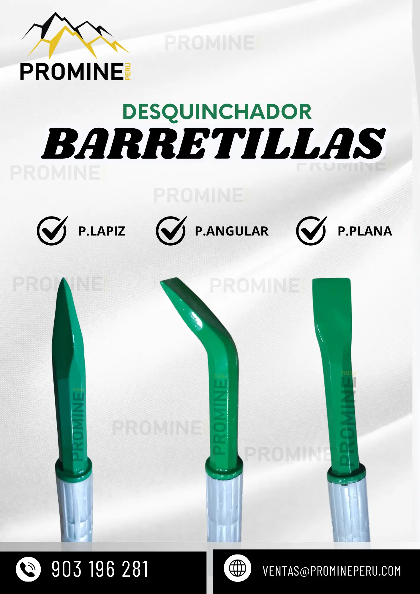 BARRETILLAS DE ALUMINIO Este producto está fabricado a base de un tubo de aleación especial de aluminio y prensadas en ambos extremos o puntas. Se caracterizan por ser livianas y ergonómicas para su fácil uso. Su principal función es prevenir la caída de las rocas e las excavaciones subterráneas. Disponible en longitudes de 4 a 14 pies. Ventajas Gran maniobrabilidad por su diseño ergonómico. Su fabricación a partir de aluminio liviano de alta resistencia, provee gran durabilidad. Contáctenos: PROMINE PERU Teléfono: (511) 7584483 Celular: 903196281 - 968712557 E-mail: ventas@promineperu.com AREQUIPA-PERÚ wwwpromineperu.com