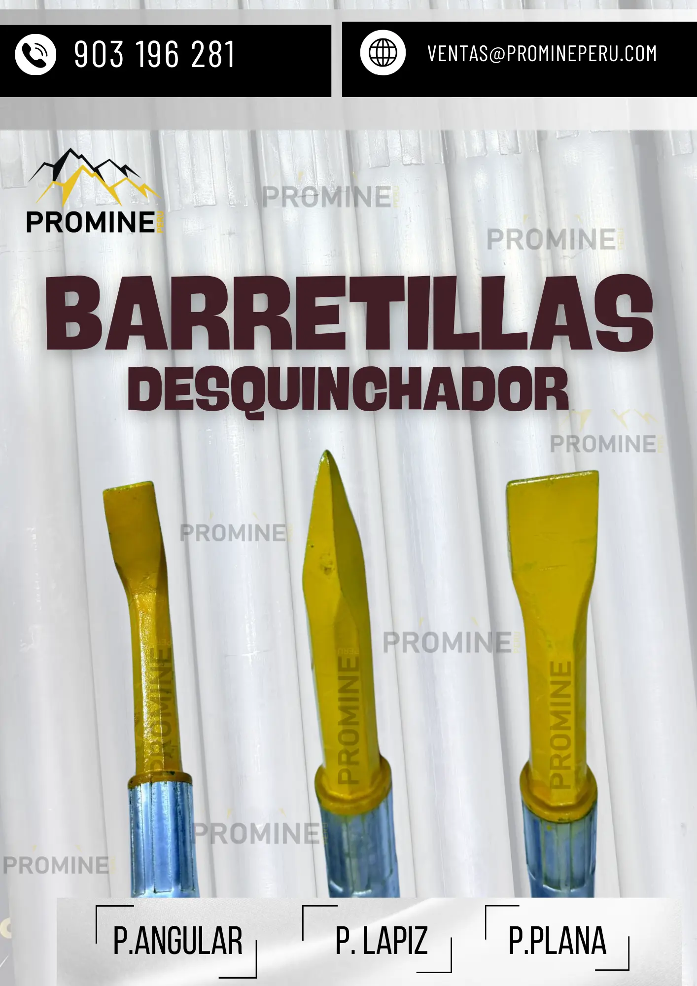 BARRETILLAS DE ALUMINIO Este producto está fabricado a base de un tubo de aleación especial de aluminio y prensadas en ambos extremos o puntas. Se caracterizan por ser livianas y ergonómicas para su fácil uso. Su principal función es prevenir la caída de las rocas e las excavaciones subterráneas. Disponible en longitudes de 4 a 14 pies. Ventajas Gran maniobrabilidad por su diseño ergonómico. Su fabricación a partir de aluminio liviano de alta resistencia, provee gran durabilidad. Contáctenos: PROMINE PERU Teléfono: (511) 7584483 Celular: 903196281 - 968712557 E-mail: ventas@promineperu.com AREQUIPA-PERÚ wwwpromineperu.com