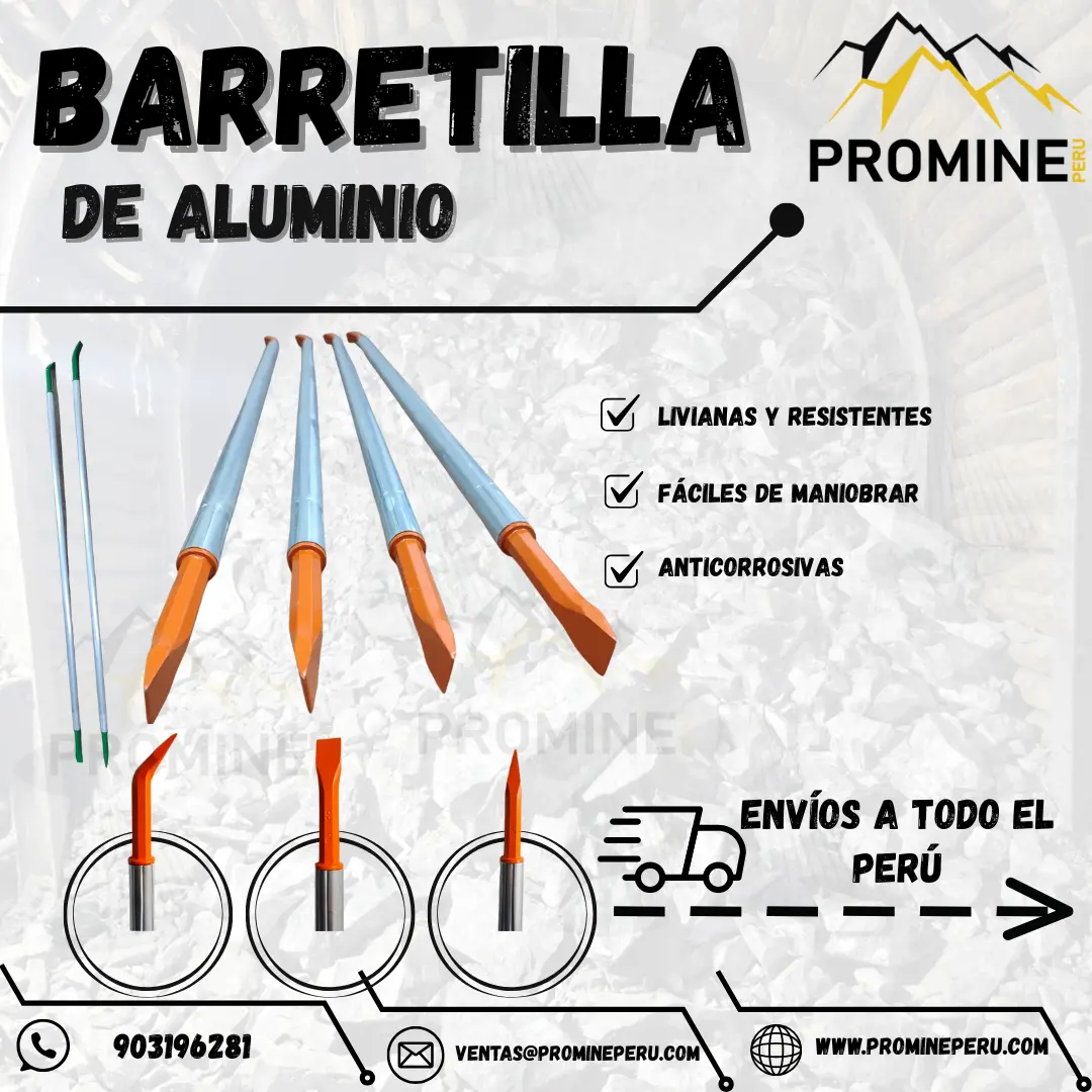 BARRETILLAS DE ALUMINIO Este producto está fabricado a base de un tubo de aleación especial de aluminio y prensadas en ambos extremos o puntas. Se caracterizan por ser livianas y ergonómicas para su fácil uso. Su principal función es prevenir la caída de las rocas e las excavaciones subterráneas. Disponible en longitudes de 4 a 14 pies. Ventajas Gran maniobrabilidad por su diseño ergonómico. Su fabricación a partir de aluminio liviano de alta resistencia, provee gran durabilidad. Contáctenos: PROMINE PERU Teléfono: (511) 7584483 Celular: 903196281 - 968712557 E-mail: ventas@promineperu.com AREQUIPA-PERÚ wwwpromineperu.com