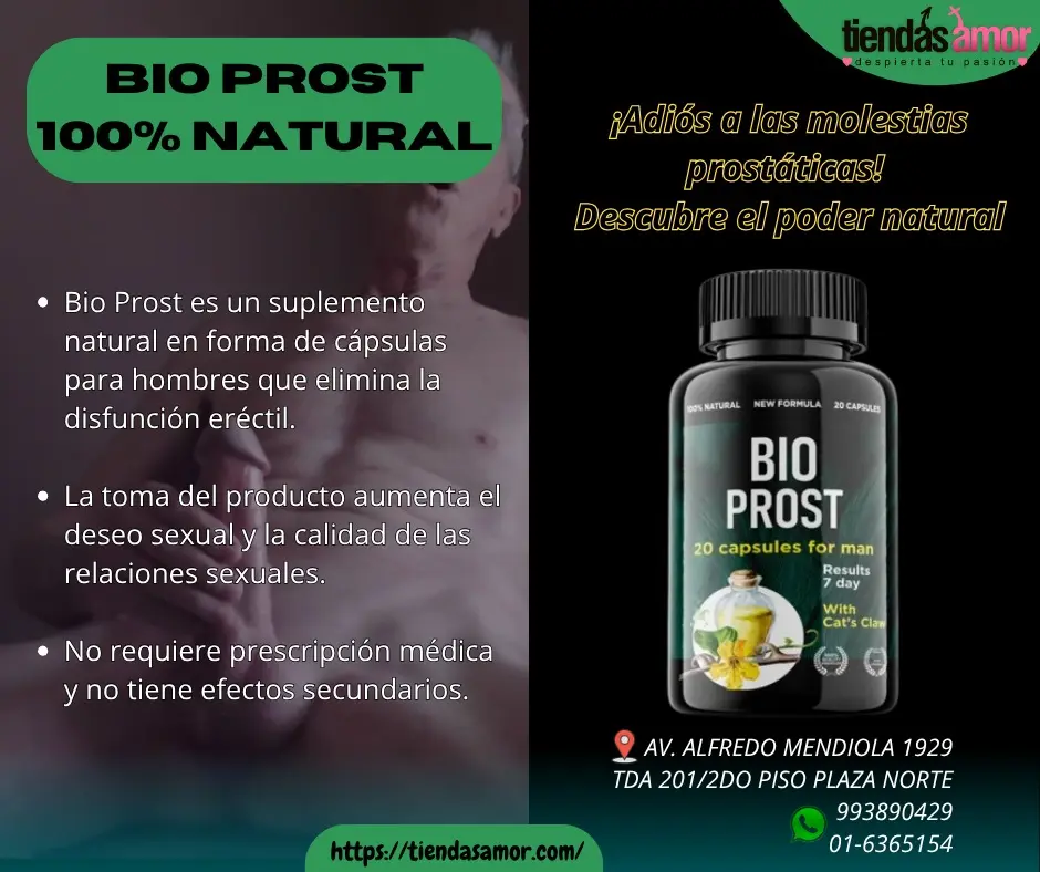 Bio Prost es un suplemento natural en forma de cápsulas para hombres que elimina la disfunción eréctil. La toma del producto aumenta el deseo sexual y la calidad de las relaciones sexuales. No requiere prescripción médica y no tiene efectos secundarios. Somos Una Empresa Dedicada A La Venta De Productos Originales Para Adultos. VISITA NUESTRA TIENDA FISICA En: Plaza Norte Av. Alfredo Mendiola 1929 Tienda 201 2do. Piso CONSULTAS Y PEDIDOS:( Teléfono 01 6365154) CEL:993890429 Realizamos Envíos A Todo El Perú. Delivery Garantizado En Toda Lima PROMOCIONES CADA SEMANA EN NUESTRAS WEBS. www.sexshopinternacional.com www.fantasiasexsual.com www.sextoyslima.com www.tiendasamor.com www.vigrx.pe www.alfamanperu.com www.bioprostoriginal.com NUESTRAS TIENDAS: AUTORIZADAS DE VENTA OFICIAL EN PERU Plaza Norte Puente Piedra Miraflores San Isidro Pro- Los Olivos Pucallpa Tarapoto HORARIOS DE ATENCIÓN De lunes A Sábados. 9:00 Am 8:00 Pm