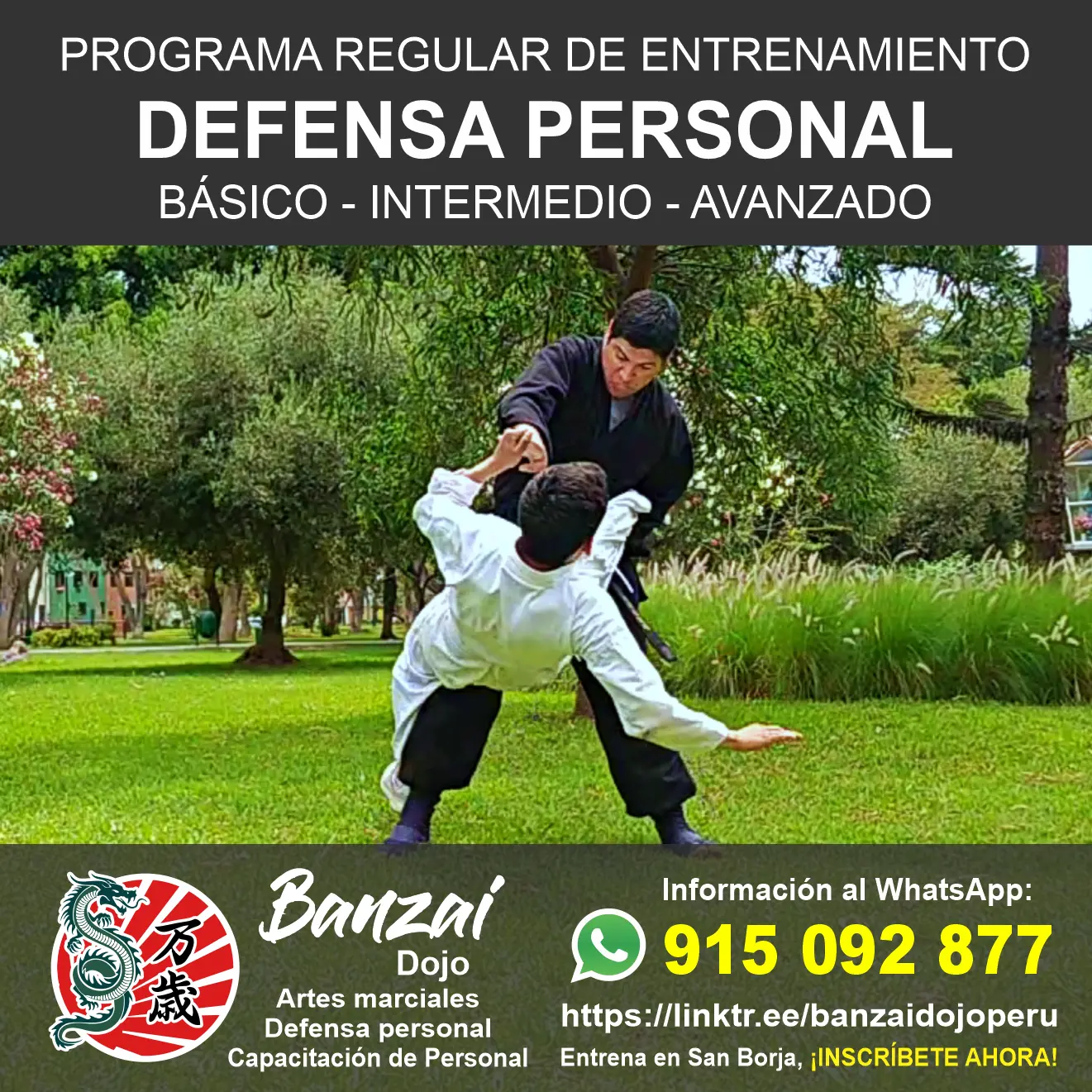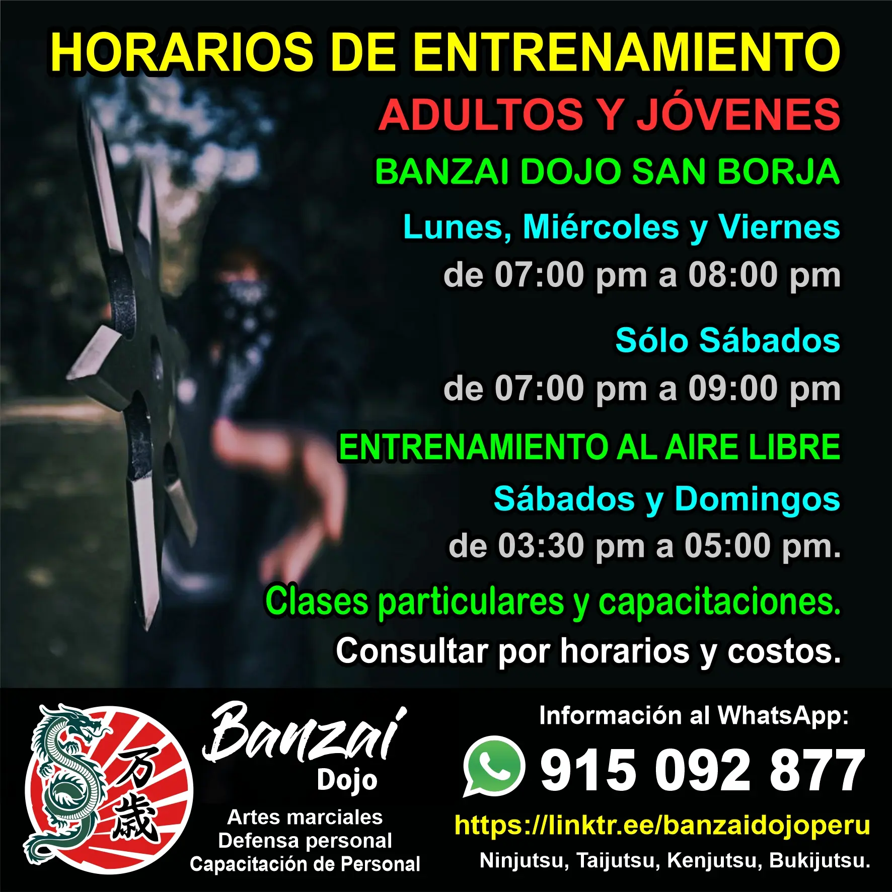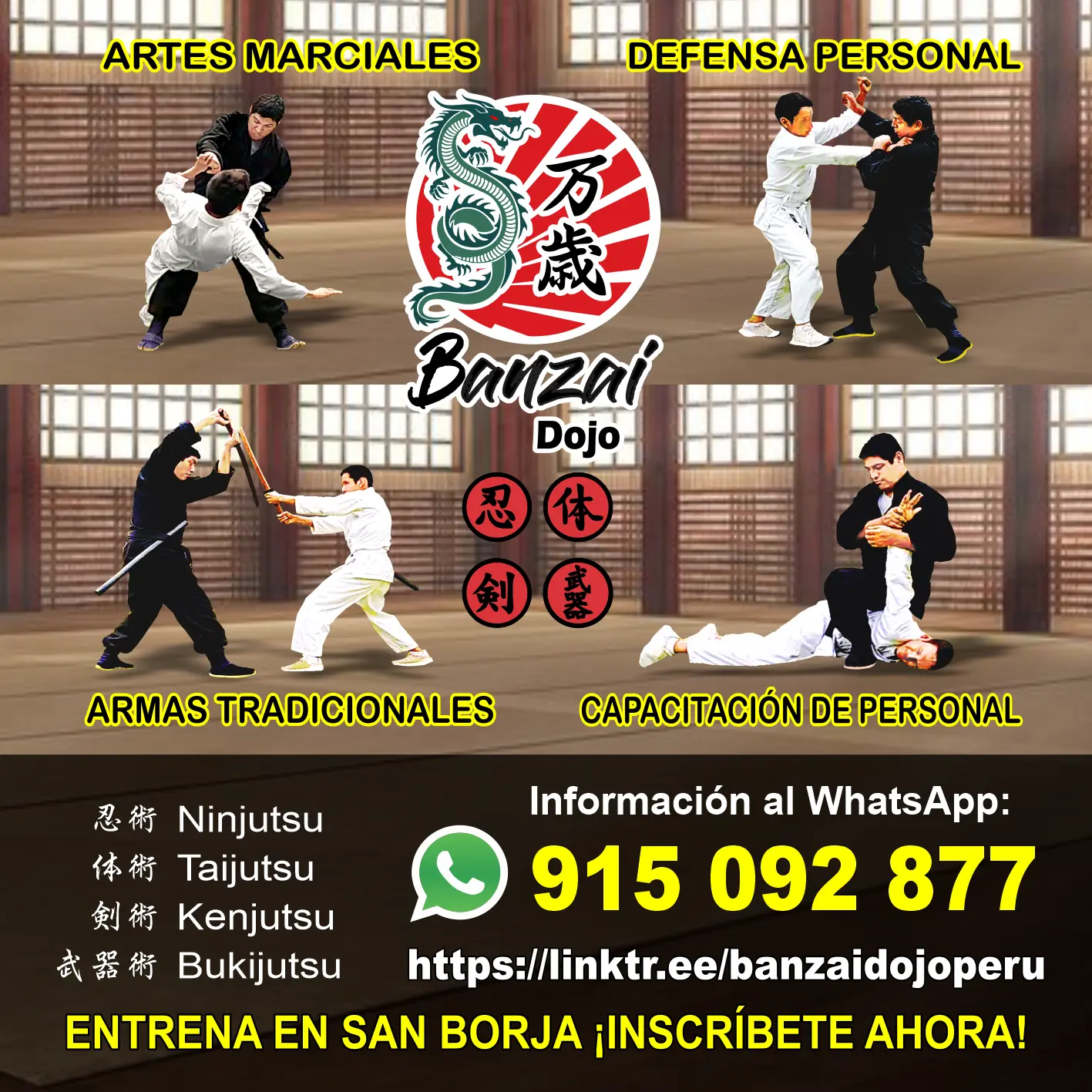 Banzai Dojo te enseña Defensa personal entrenándote con Artes marciales Ninja: Taijutsu, Kenjutsu, Bukijutsu y también capacita Personal de Seguridad. -- Banzai Dojo SAN BORJA está en Av. Canadá con Av. Guardia Civil - San Borja -- ADULTOS Y JÓVENES Horarios: Sólo Sábados de 07:00 pm a 09:00 pm -- Lunes, Miércoles y Viernes de 07:00 pm a 08:00 pm -- Informes al WhatsApp 51 915 092 877 -- https://walink.co/d8af79 -- Conoce más de BANZAI Dojo en: https://linktr.ee/banzaidojoperu