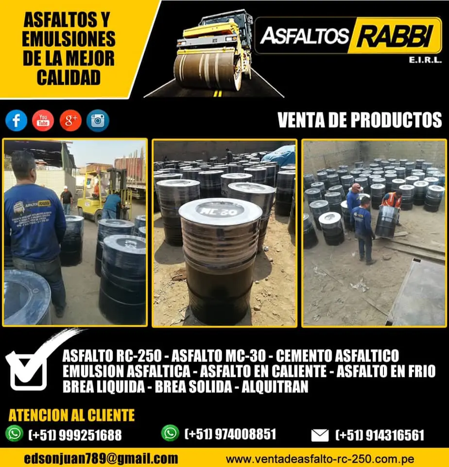 Servicios y productos Venta De Emulsión Asfáltica Venta De Asfalto Líquido Mc-30 Venta De Brea Líquida Pintura Para Tráfico Venta De Asfalto En Frío Y Caliente Venta De Asfálticos Líquidos Venta De Cemento Asfáltico Pen 60-70 Ventas Impermeabilizantes De Asfalto Rc-250 Líquido Venta De Asfaltos Y Agregados Alquitran Pavimentacion Asfáltica Equipos Para Asfaltados Venta De Asfaltos Producciones De Mezclas Asfálticas Breas Liquidas BRINDAMOS ASESORAMIENTO POR TECNICOS/INGENIEROS CONTACTANOS:999251688-974008851 -