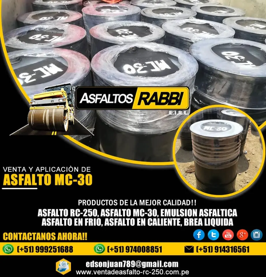 Asfalto Rc-250 Asfalto MC-30 Asfalto Pen 60/70 85/100 Alquitrán Impermeabilizante. Emulsion Asfaltica de Lenta y R Emulsion Asfaltica de roptura rápida Emulsión Asfáltica Css-1hp. Brea Liquida en Cilindros de 55 Glns. Impermeabilizante Palos Galpones contra el salitre Impermeabilizante para Techos para Postes Pintura Para Tráfico CEL.999251688 - 974008851