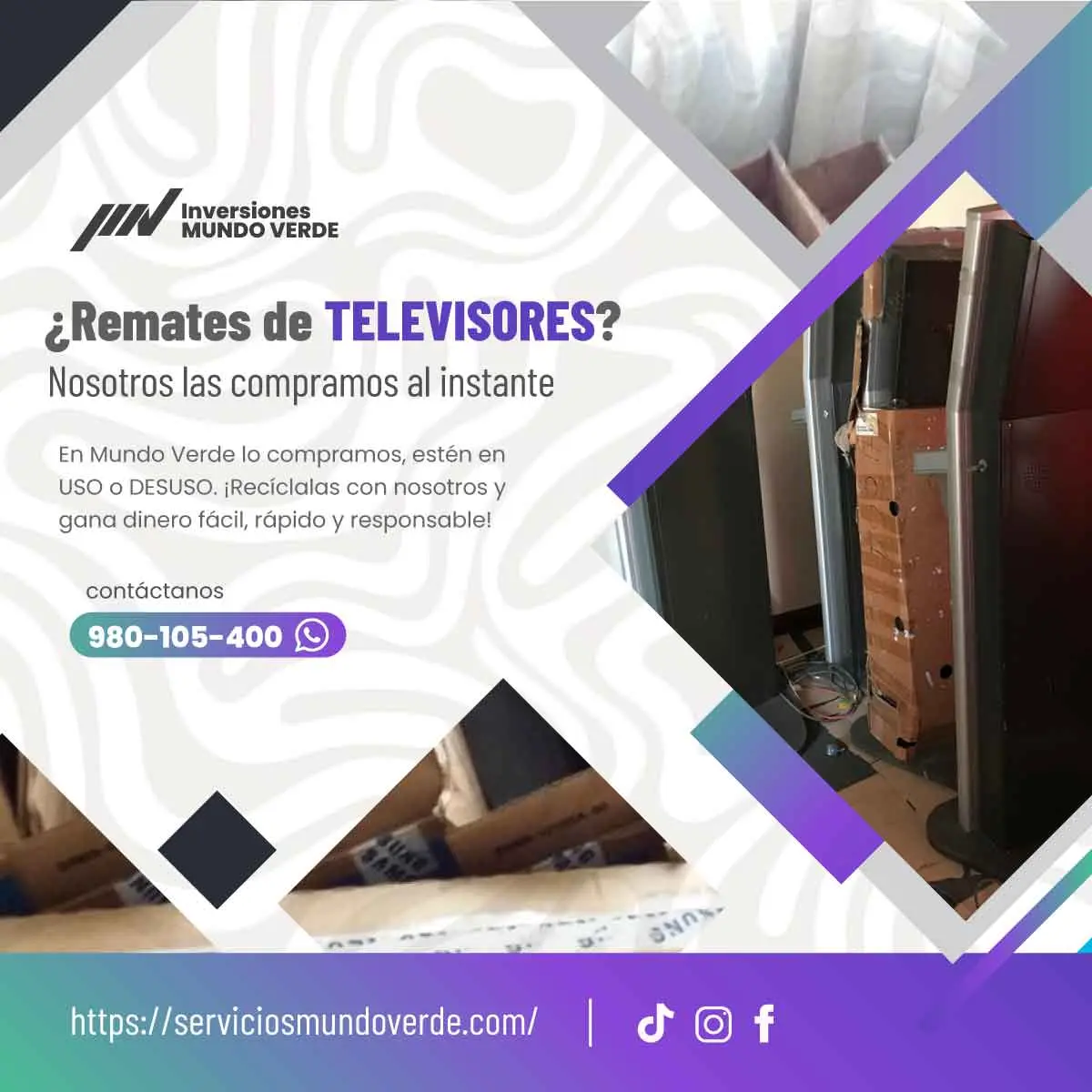 ¿Tienes televisores antiguos, malogrados o en desuso? ¡Nosotros los compramos! Adquirimos TVs de todo tipo y tamaño, ya sean LCD, LED, plasma o CRT, estén funcionando o no. Ofrecemos una solución de reciclaje rápida, segura y responsable en toda Lima. Compramos televisores individuales o por lote Retiro a domicilio, empresas o almacenes Pago inmediato y sin complicaciones Contáctanos hoy mismo y dale un valor renovado a tus televisores usados. Servicio Mundo Verde 980105400