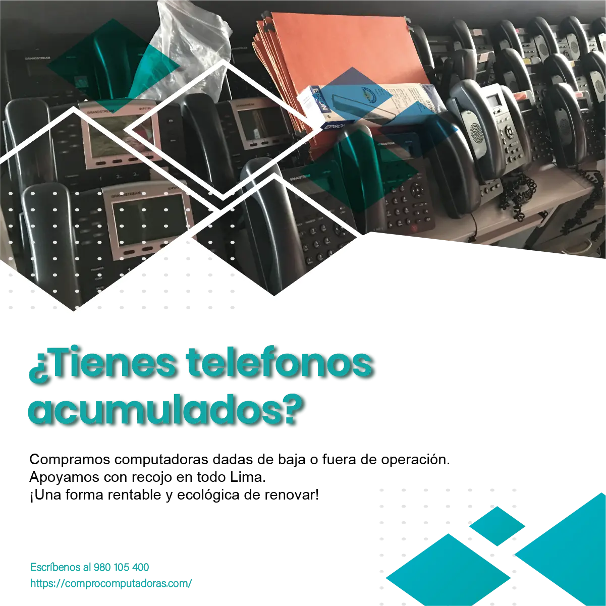 ¿Tienes teléfonos en desuso acumulados? ¡Nosotros los compramos! Funcionen o no, les damos un destino útil y responsable. Reciclaje seguro en toda Lima Pago rápido y justo Recojo gratuito a domicilio o empresa Compramos todo tipo de teléfonos: antiguos, malogrados o dados de baja Libera espacio, gana dinero y ayuda al medio ambiente. Contáctanos hoy mismo al 980105400 ¡Haz que tus equipos acumulados tengan un nuevo propósito!