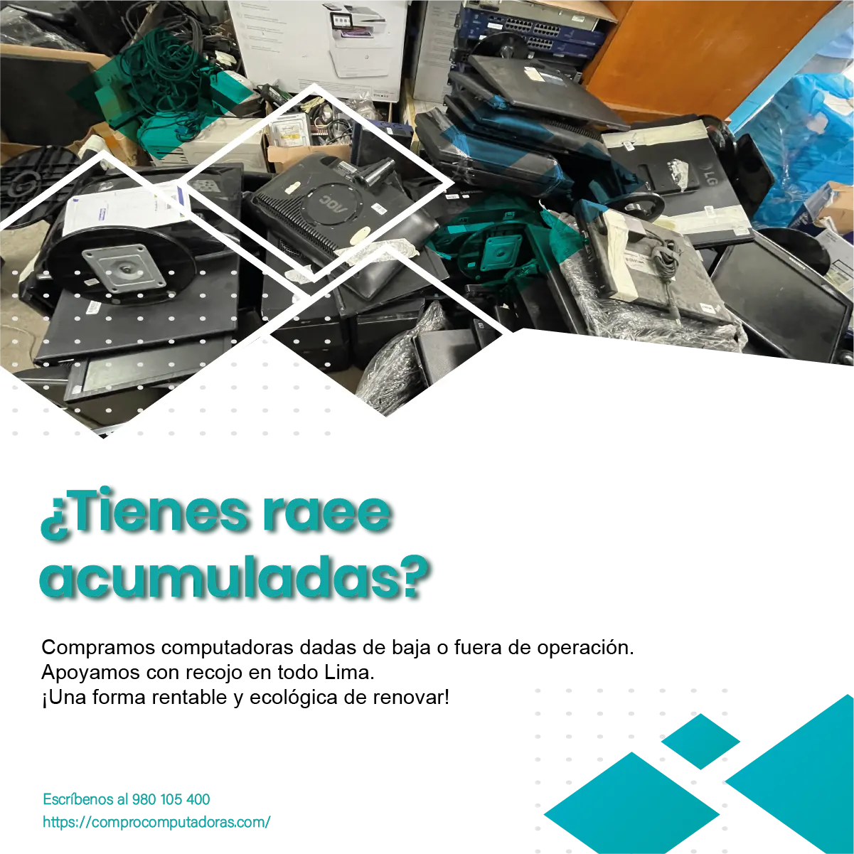 ¿Tienes equipos electrónicos dados de baja o fuera de uso? ¡Nosotros los compramos! Especialistas en la recolección de RAEE (Residuos de Aparatos Eléctricos y Electrónicos), ofrecemos una solución segura, eficiente y responsable en toda Lima. Computadoras, laptops, monitores, impresoras Celulares, servidores, cargadores, cables y más Equipos malogrados, obsoletos o en desuso Liberas espacio Ganas dinero al instante Contribuyes con el medio ambiente Recojo sin costo en tu domicilio u oficina Pago rápido y justo Contáctanos al 980105400 ¡Dale un final útil y responsable a tus residuos electrónicos!