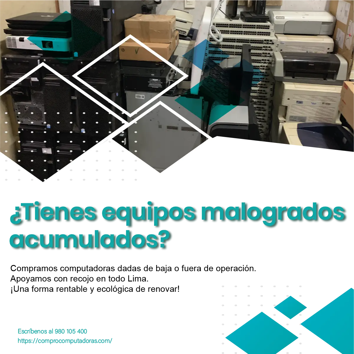 ¿Equipos malogrados ocupando espacio? ¡Nosotros los compramos! No importa si ya no encienden o están dañados, les damos un destino útil y responsable. Computadoras, laptops, monitores Impresoras, fotocopiadoras Celulares, routers, servidores Cables, cargadores y más Reciclaje responsable en toda Lima Pago inmediato Recojo gratuito Aceptamos equipos en cualquier estado Contáctanos al 980105400 ¡Libera espacio, gana dinero y cuida el medio ambiente!