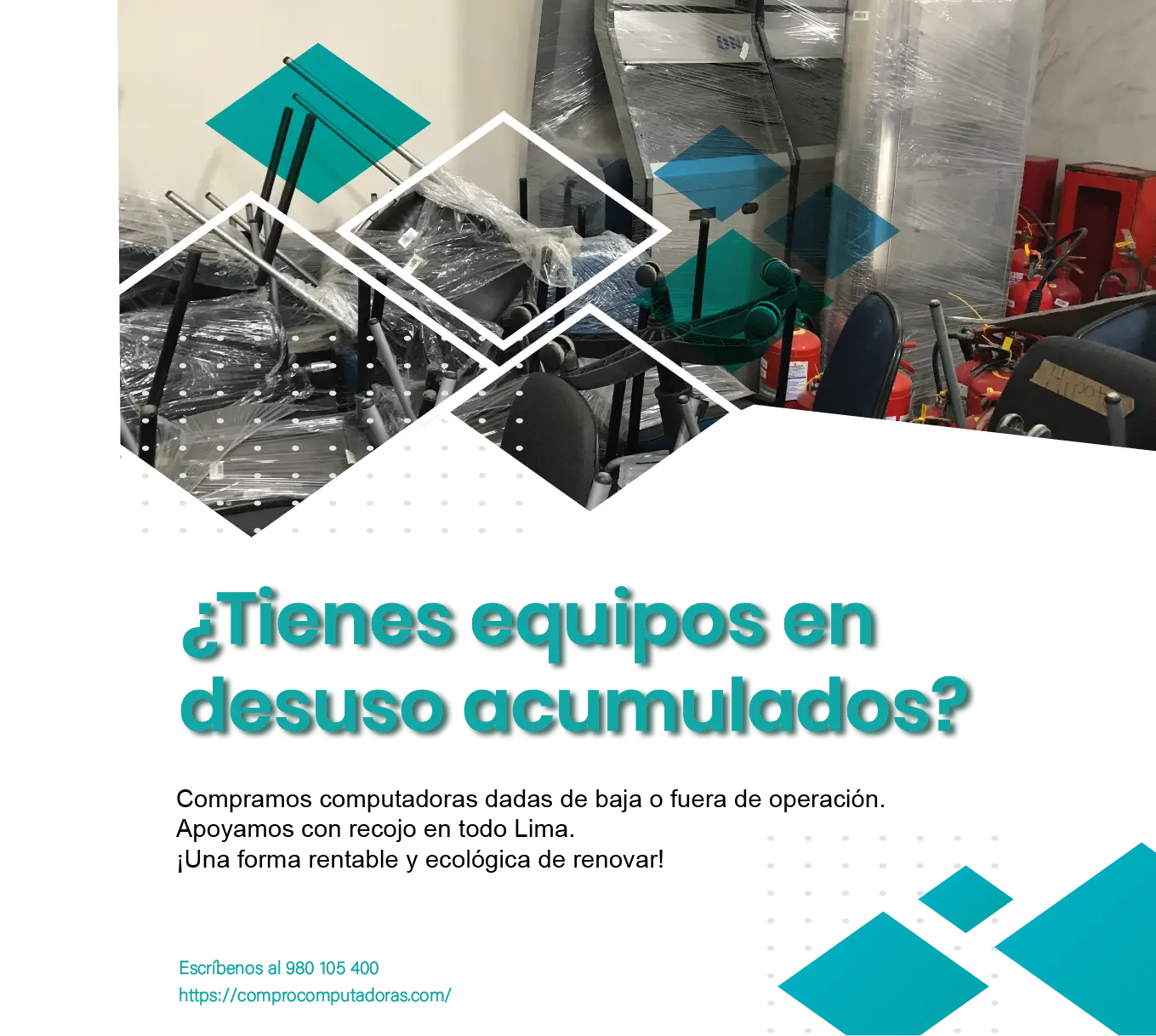 ¿Tienes equipos en desuso ocupando espacio? ¡Nosotros los compramos! Funcionen o no, les damos un valor renovado con un proceso de reciclaje responsable. Computadoras Laptops Monitores Impresoras Fotocopiadoras Servidores Celulares Cables Cargadores y más Recojo gratuito en toda Lima Pago inmediato y justo Soluciones rápidas para hogares, oficinas y empresas Contáctanos al 980105400 Recicla con nosotros y transforma lo que no usas ¡en dinero en efectivo!
