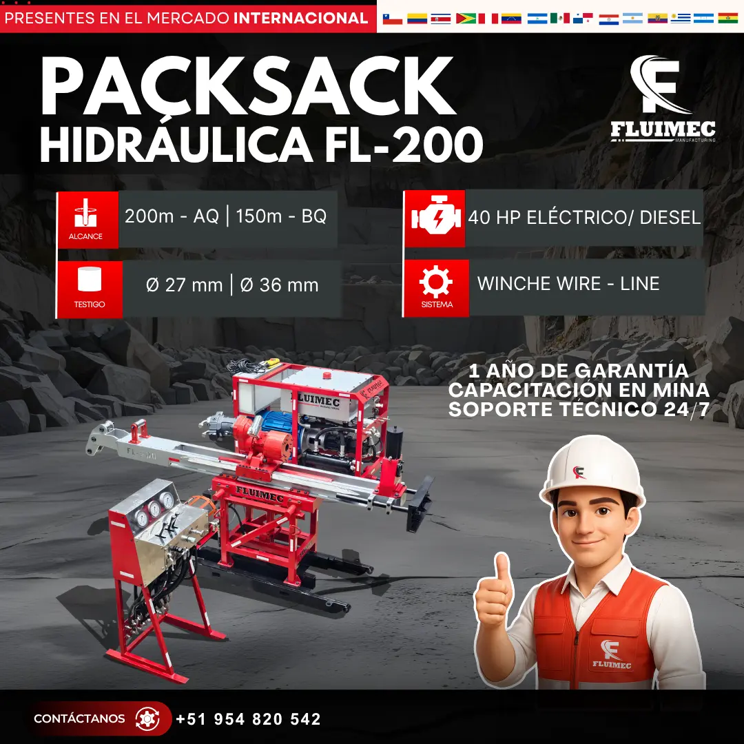 PACKSACK DIAMANTINA FL-200 Este equipo tiene un alcance de perforación de 150 metros en línea BQ y 200 metros en línea AQ con diámetro de recuperación de 36 mm y 27mm. Consta de tres componentes: Unidad de Potencia, Unidad de Control y Unidad de Perforación. Trabaja con sistema de WINCHE WIRE-LINE para la rápida recuperación de núcleos para estudios geológico, siendo un equipo versátil de fácil operación, armado y desarmado. CARACTERISTICAS ALCANCE: BQ 150 Mt / AQ 200 Mt TESTIGO: 36 mm / 27 mm MOTOR: Eléctrico/Diésel 40 HP CABEZAL: Pasante BQ ÁNGULO: Positivo/ negativo (90°) SISTEMA: Winche Wire - Line CÁMARA: 4.0m x 4.00m x 5.00m