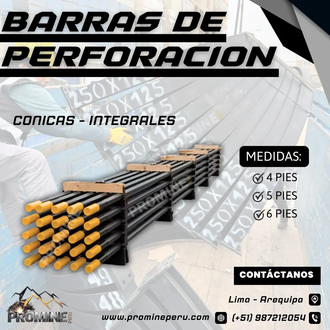 Las barras cónicas e integrales representan elementos indispensables en los equipos de perforación empleados tanto en minería subterránea como en obras geotécnicas. Se caracterizan por su estructura robusta y por facilitar una transferencia de energía eficiente entre la perforadora y la broca, lo que se traduce en avances de perforación rápidos y precisos, incluso frente a formaciones rocosas muy duras o abrasivas. En el caso de las barras cónicas, estas poseen un extremo con un cono mecanizado que se acopla con seguridad a la broca, brindando un ensamble firme y de fácil instalación. PROMINE Consultas: Móvil | WhatsApp Celular: 987212054 - https://wa.link/7h770l Correo: ventas@promineperu.com
