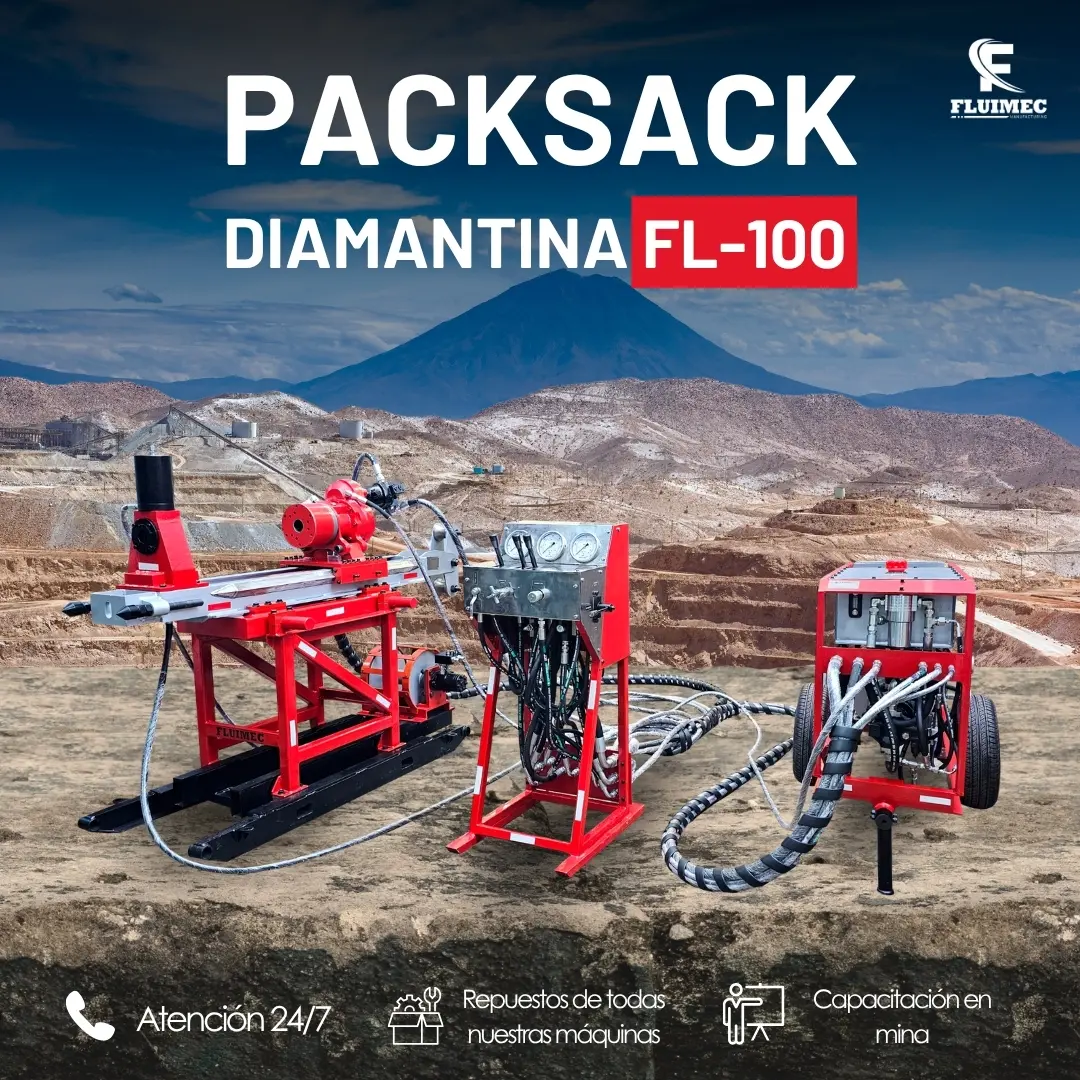 PACKSACK DIAMANTINA FL100 Este equipo tiene un alcance de perforación de 150 metros en línea AQ y 50 metros en línea BQ con diámetro de recuperación de 27 mm y 36mm. Consta de tres componentes: Unidad de Potencia, Unidad de Control y Unidad de Perforación. Trabaja con sistema de WINCHE WIRE-LINE para la rápida recuperación de muestras. CARACTERISTICAS MOTOR: Eléctrico/Diésel 30 HP CABEZAL: Pasante AQ ALCANCE: AQ-150 Mt / BQ -50 Mt ESTIGO: 27 mm / 36 mm ANGULO: Positivo/negativo (90°) SISTEMA: Winche Wire Line CÁMARA: 3.0m x 3.00m x 4.00m