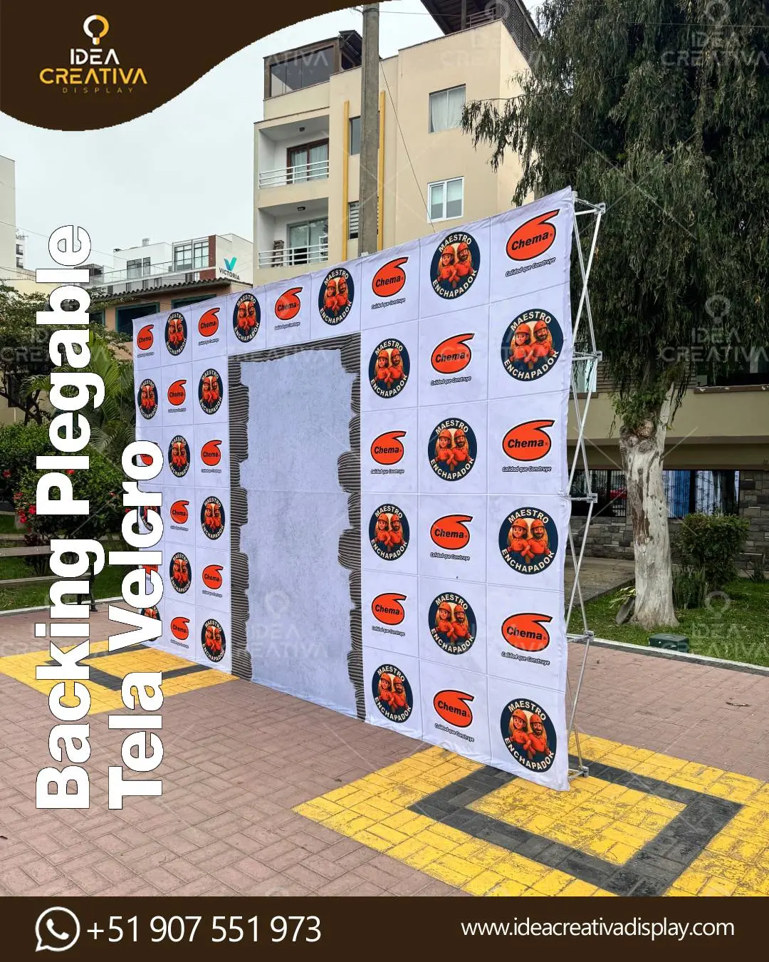 Destaque en su próxima feria con el Backing Plegable de Tela con Velcro (Pop Up). Es la estructura más rápida de instalar del mercado: se expande y la gráfica de tela queda perfectamente tensa gracias al sistema de velcro perimetral. Olvídese de las arrugas y los reflejos en las fotos. Ideal para conferencias de prensa y activaciones premium. Incluye maleta acolchada para fácil traslado. ¡Escríbanos para conocer las medidas disponibles y solicite su cotización personalizada!