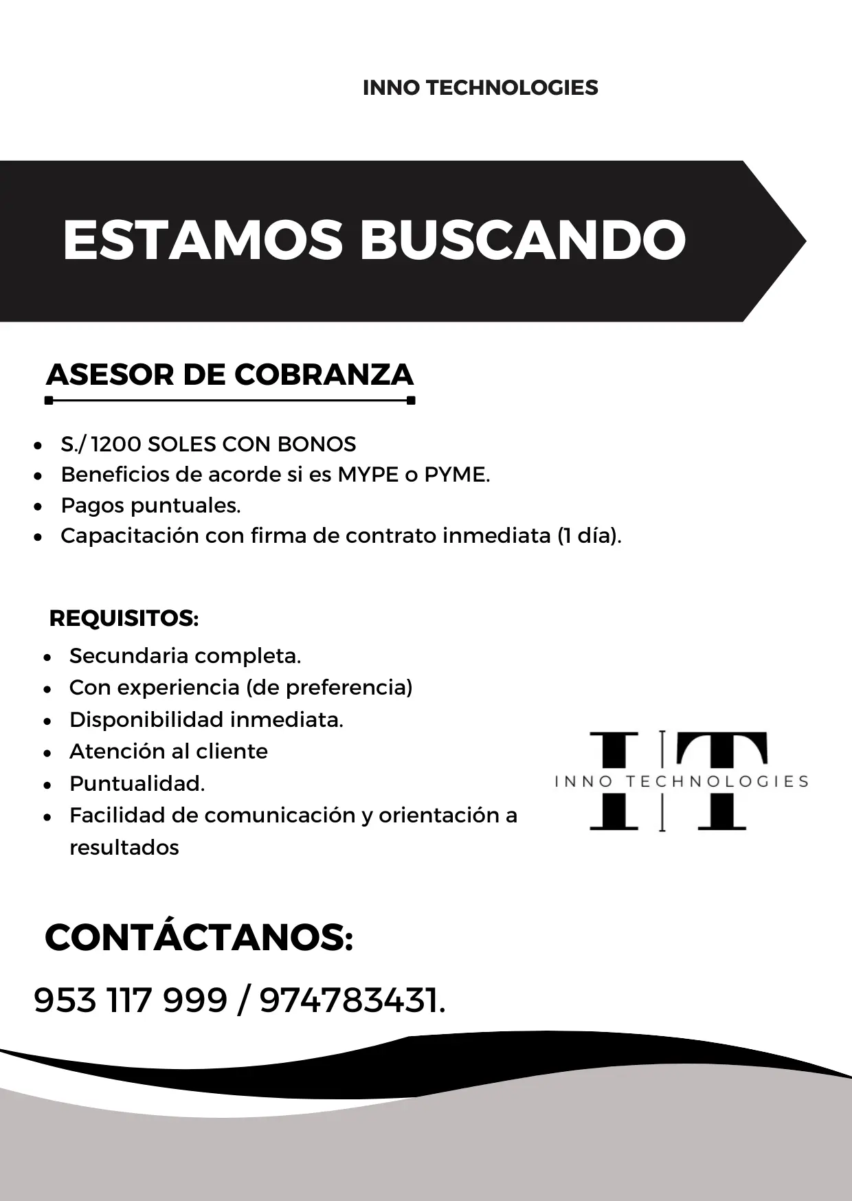 | Funcion: | Contactar a clientes con pagos pendientes vu00eda llamadas y mensajes, brindar informaciu00f3n clara sobre sus deudas y fechas de pago, negociar compromisos de pago de manera respetuosa, Registrar gestiones realizadas en el sistema y cumplir metas de cobranza asignada |