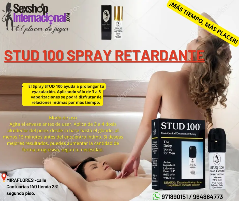 STUD 100 es una alternativa natural a los problemas de eyaculación precoz. Es un spray elaborado especialmente para retardar la eyaculación Resultados positivos aprobados por la FDA Ayuda a solucionar los problemas de eyaculación precoz Erecciones más duraderas y retrasa el orgasmo Ayuda a disfrutar durante más tiempo de las relaciones sexuales Hace efecto después de 5- 15 minutos después de la aplicación Compatible con el uso de condones Producto natural sin efectos secundarios El spray Stud 100 es discreto y cómodo de llevar. ENVIOS A TODO LIMA Y PROVINCIAS - PEDIDOS AL: 969889888 / 971890151 MIRAFLORES CALLE CANTUARIAS 140 TIENDA 231 SEGUNDO PISO. https://sexshopinternacional.com/