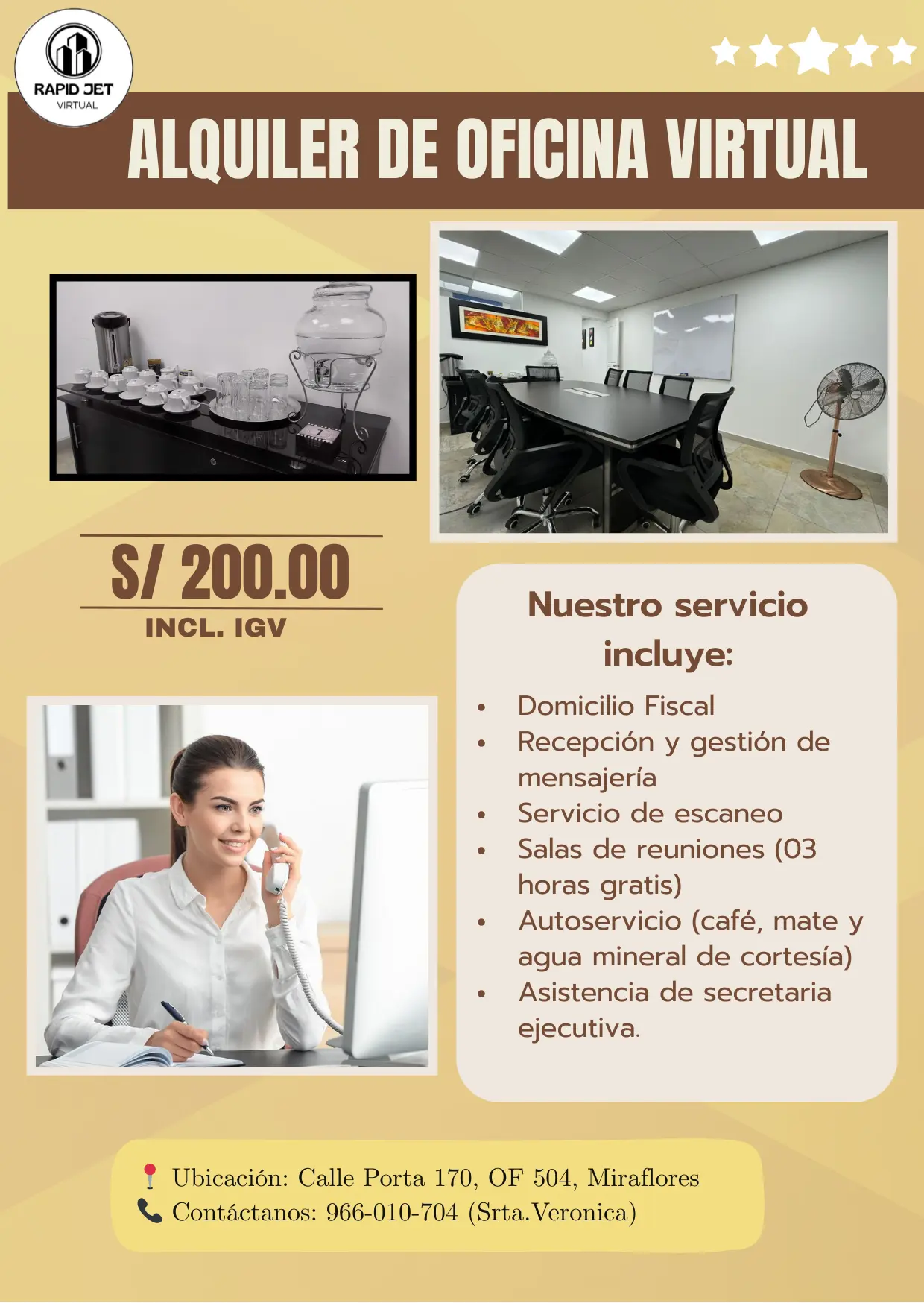 PLAN PYME: La mejor forma de iniciar el 2026 Costo: S/200.00 (Incluye IGV) Te brindamos: Domicilio Fiscal, Recepción y gestión de mensajería, Servicio de escaneo, Salas de reuniones (03 horas gratis), Autoservicio (café, mate y agua mineral de cortesía) y Asistencia de secretaria ejecutiva. Ubicación: Calle Porta 170, OF 504-507-511, Miraflores Contáctanos: 962-752-622/ 966-010-704 (Sta Veronica) Horario: Lunes a viernes de 9:00 am - 7:00 pm