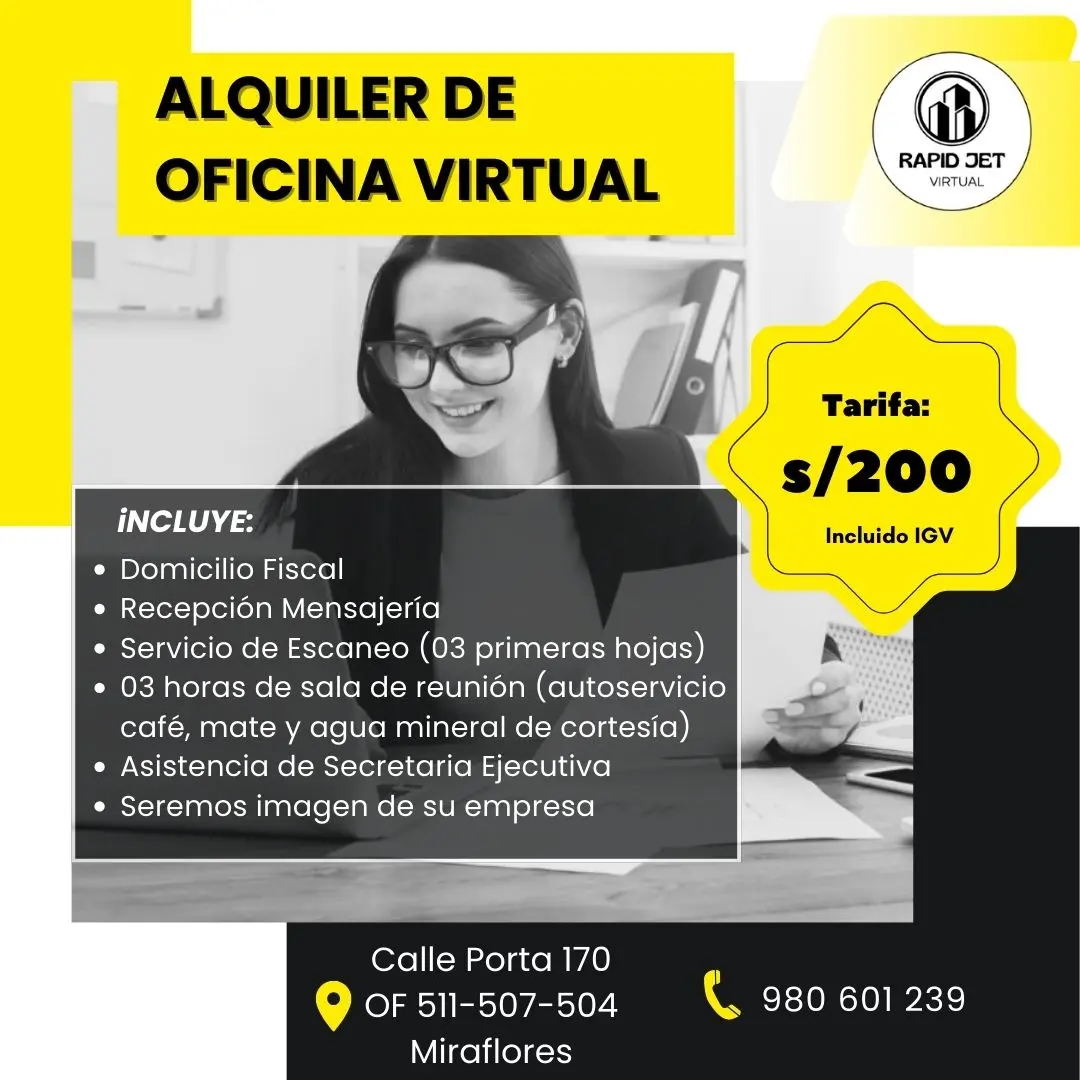 ¡ÚLTIMOS CUPOS DISPONIBLES! ¿Necesitas una dirección fiscal y una imagen profesional sin gastar en alquileres costosos? Nuestro PLAN PYME de Oficina Virtual es la solución ideal para tu negocio. Incluye: Domicilio fiscal- Recepción y gestión de mensajería - Escaneo de documentos - 3 horas de sala de reuniones al mes - Asistencia de secretaria ejecutiva / Desde S/ 200.00 inc. IGV / Estamos ubicados en Calle Porta 170 OF 511 - Miraflores Contáctanos ahora: 980 601 239/ Aprovecha los últimos cupos y dale a tu empresa la imagen profesional que merece.