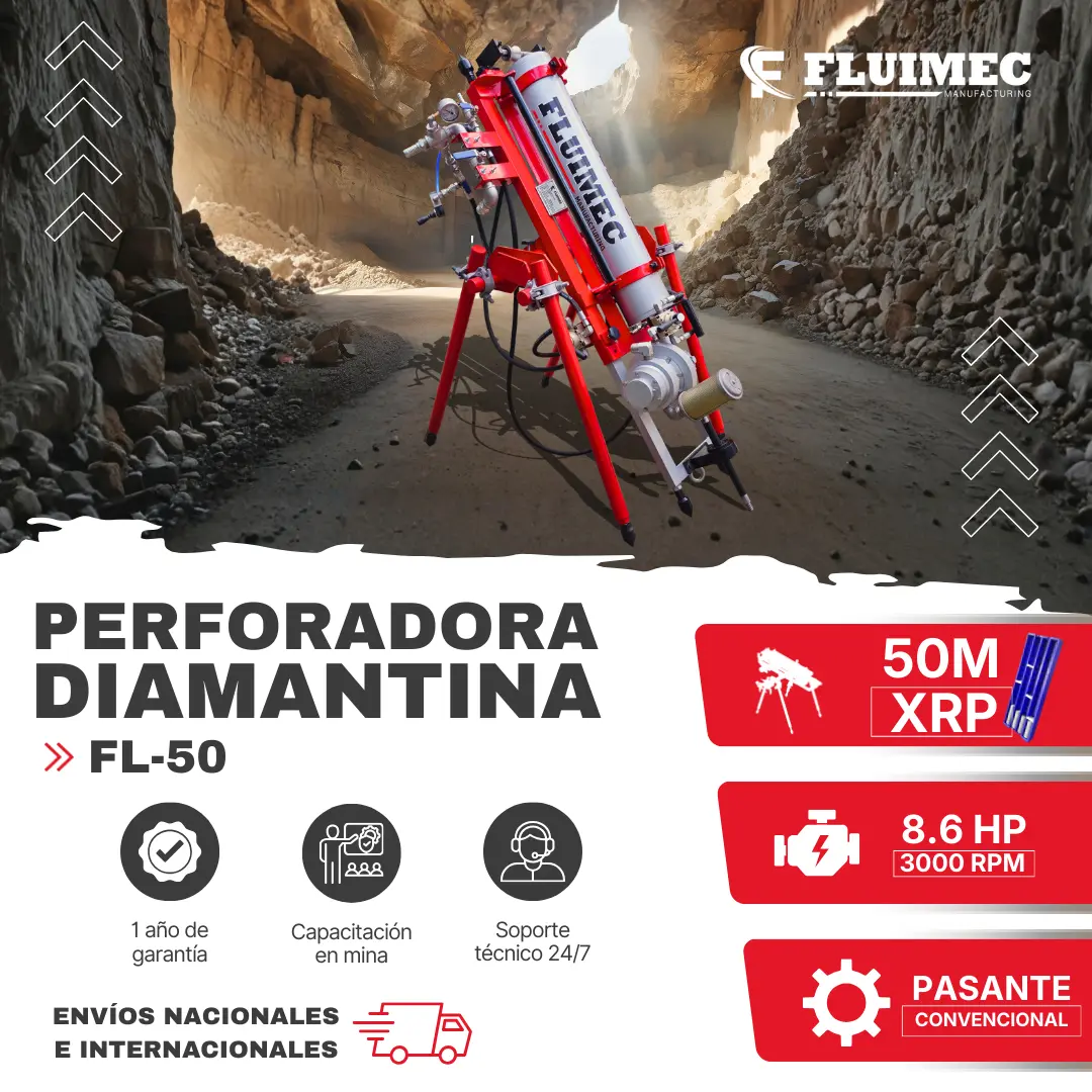 PACKSACK NEUMÁTICA FL-50 Es una máquina de perforación diamantina con un alcance de 50 metros, diámetro de muestra de 23 mm y una potencia de 8.6 HP. Ideal para exploraciones en subsuelo, estudios geológicos y muestreo de terreno. Garantizamos el stock permanente de accesorios y repuestos originales para nuestros equipos diamantina. CARACTERÍSTICAS: Alcance: XRP - 50 m Testigo: Ø 23 mm Motor: Neumático 8.6 HP (3000 RPM) Cabezal: Convencional Ángulo: Positivo / Negativo (90°) Cámara: 2.2 m x 2.2 m x 2.2 m