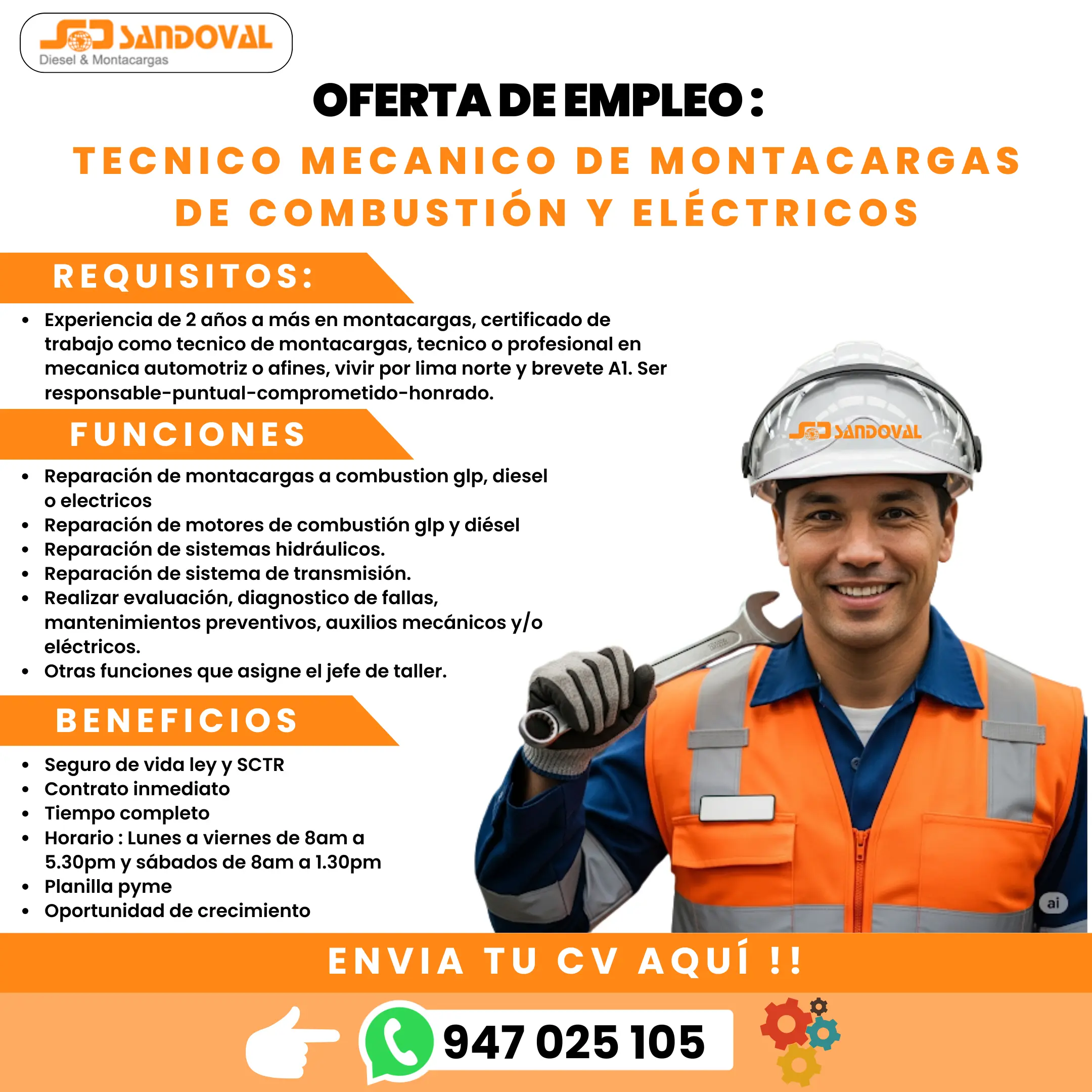 En Corporación Sandoval buscamos técnicos mecánicos con experiencia en reparación de montacargas (GLP, diésel y eléctricos). Busca a los mejores mecánicos de montacargas de combustión para su STAFF DE MECANICOS Experiencia de 2 años a mas en montacargas, certificado de trabajo como técnico de montacargas, técnico o profesional en mecánica automotriz o afines Conocimientos en reparación de motor, transmisión, sistema hidráulico ,sistema de combustión ,sistema eléctrico, sistema de frenos. Vivir por lima norte y contar con brevete A1 Responsable, puntual, comprometido y honrado. Funciones Reparación de montacargas a combustión glp, diésel o eléctricos · Reparación de motores de combustión glp y diésel . Reparación de sistemas hidráulicos. · Reparación de sistema de transmisión. · Realizar evaluación, diagnostico de fallas, mantenimientos preventivos, auxilios mecánicos y/o eléctricos. Otras funciones que asigne el jefe de taller. Te Ofrecemos Seguro de vida ley y SCTR Contrato inmediato Planilla MYPE Oportunidad de crecimiento Competencias Blandas Honesto, colaborador, dinámico, disposición para trabajar en equipo, tolerante al trabajo bajo presión, actitud positiva frente al trabajo y buen trato a todo nivel. Tipo de puesto: Tiempo completo, Por contrato Horario: Lunes a viernes de 8am a 5.30pm y Sábados de 8am a 1.30pm
