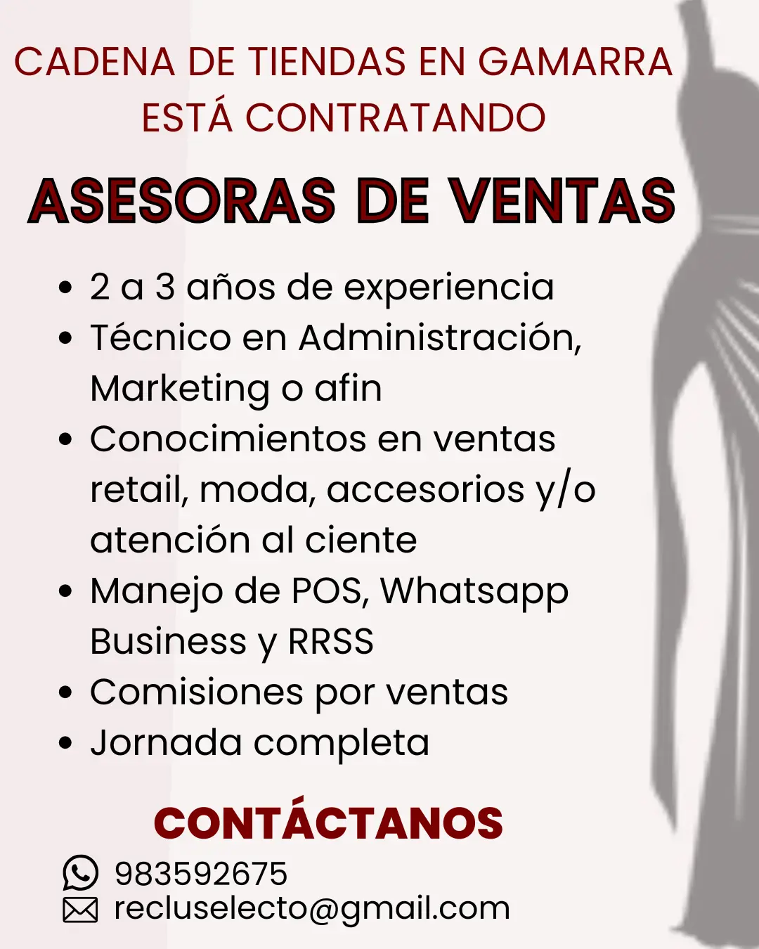 Cadena de ropa femenina en Gamarra esta en busqueda de Asesoras de Ventas