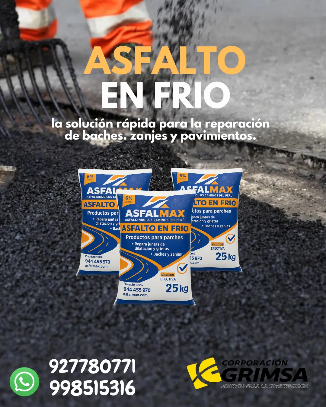 Toma el control de tus pavimentos! No necesitas equipo pesado ni largas esperas para tener una reparación profesional. Nuestro Asfalto en Frío de 25kg es la SOLUCIÓN EFECTIVA que cabe en tus manos. Repara baches, zanjas y juntas de dilatación con una fórmula de alto rendimiento. Motiva a tu equipo, acelera tus obras. Llama y empieza a transformar tus caminos HOY. CUALQUIER CONSULTA, CONTACTENOS: 998515316 / 927780771