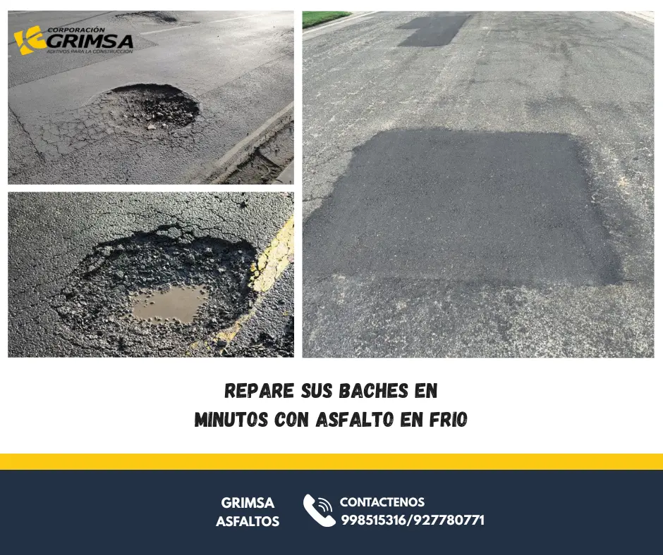 ¡Así de fácil reparar un bache! Asfalto frío listo para usar, ideal para baches, zanjas y reparaciones rápidas. Solo barra, rellene y compacte ¡Y listo! Sin mezclar, ni calentar Sin maquinaria Mantiene su rendimiento incluso en condiciones húmedas. Disponible en bolsas de 25kg. ¡Reparaciones rápidas y permanentes! CUALQUIER CONSULTA, CONTACTENOS: 998515316 / 927780771