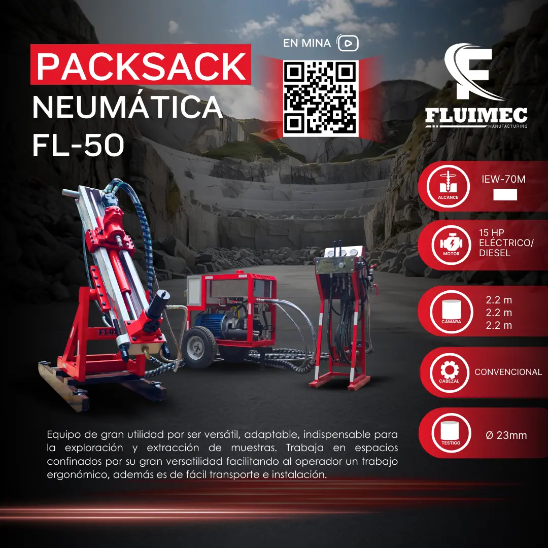 PACKSACK HIDRÁULICA FL-50 Equipo con alcance de perforación de 70 metros en línea IEW, diámetro de muestra de 25 mm, indispensable para la recuperación y extracción de muestras. Se caracteriza por su versatilidad, fácil armado, transporte sencillo y adaptación a espacios confinados. CARACTERÍSTICAS: Alcance: IEW 70 m Testigo: Ø 25 mm Motor: Eléctrico / Diésel 15 HP Cabezal: Convencional Ángulo: Positivo / Negativo (90°) Cámara: 2.5 m x 2.5 m x 3 m Garantizamos el stock permanente de accesorios y repuestos originales. ¡SOLICITA TU COTIZACIÓN AHORA! (511) 361 6908 / 954 820 542