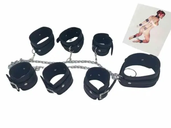 Explora Tus fantasías fetichistas con este principiante arnés total, antebrazos, muñecas y tobillos, esposas de cuero y estos son juegos son cómodamente limitada para verse y sentirse atractiva. Código: PD2021-18 Material cuero Esposas múltiples Hecho en usa.