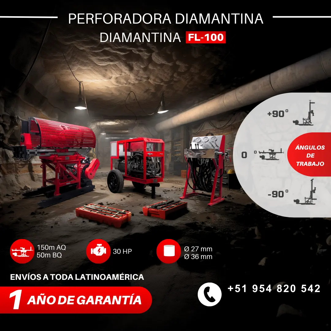 PERFORADORA PACKSACK FL-100 Explora hasta 150 m en AQ y 50 m en BQ, con testigos de 27 mm y 36 mm. Cuenta con una potencia de 30 HP y un abanico de trabajo de 180°, ideal para perforaciones y sondajes precisos. Somos Fluimec, fabricantes y distribuidores de la marca Packsack. Garantizamos el stock permanente de accesorios y repuestos originales. ¡SOLICITA TU COTIZACIÓN AHORA! 51 954 820 542 cotizaciones@fluimec.com www.fluimec.com www.packsack.com.pe