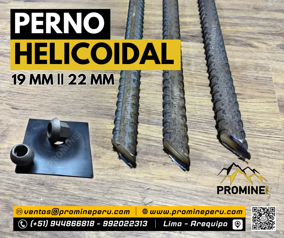 Elemento de sostenimiento mecánico para excavaciones subterráneas. Instalación con cartucho de resina o cemento, alta capacidad de carga. Solicita más información PROMINE - SEDE LIMA: Consultas: Móvil | WhatsApp Celular: 944866818 - https://wa.link/bkcrr3 Celular: 987212054 - https://wa.link/7h770l Celular: 968712557 - https://wa.link/hbiyxd Celular: 992022313 - https://wa.link/cxff32 Correo: ventas@promineperu.com