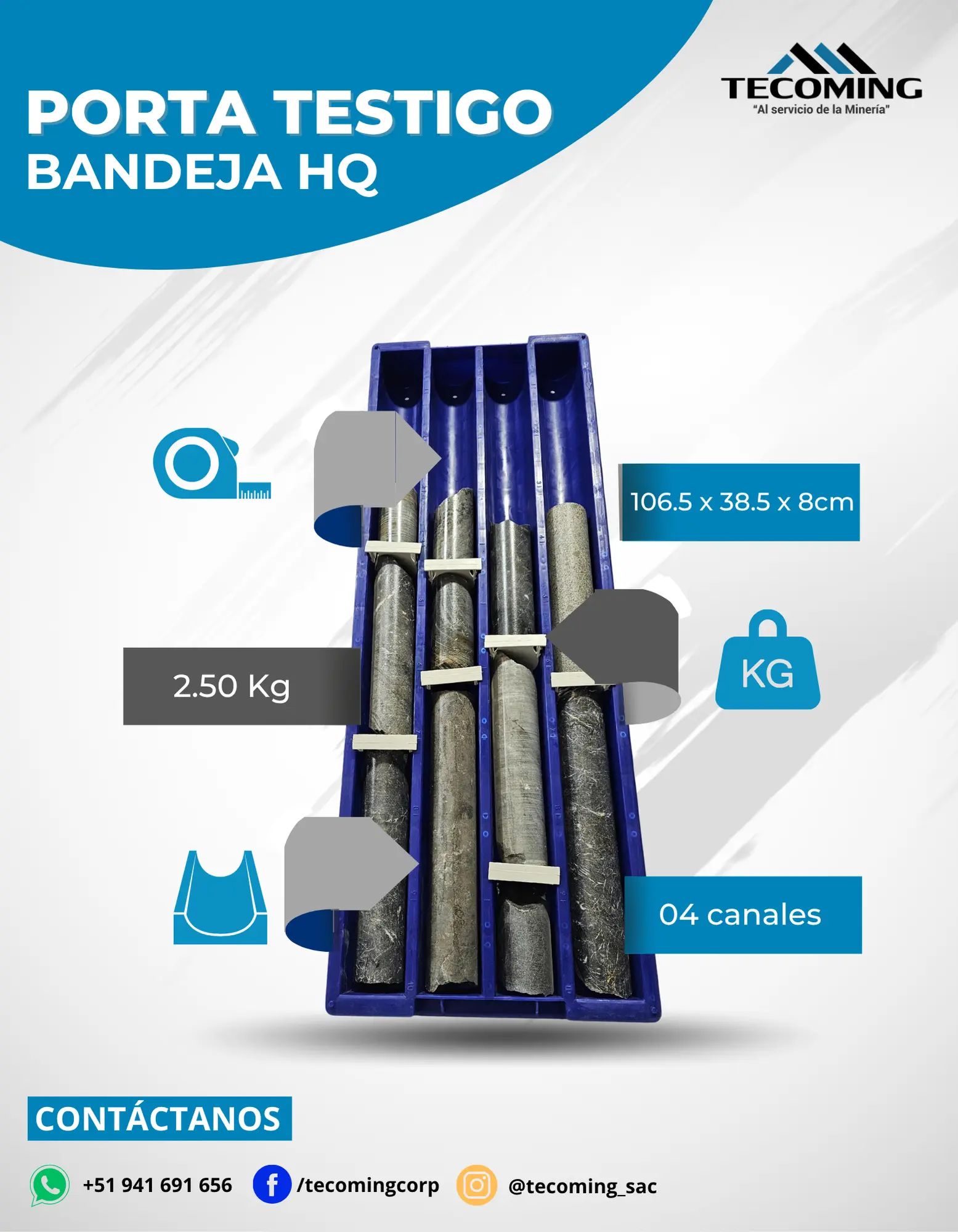 BANDEJA PORTA TESTIGO HQ MINERÍA Y EXPLORACIÓN Fabricantes nacionales de bandejas porta testigo línea HQ, diseñadas para almacenamiento, registro y transporte seguro de muestras geológicas de perforación diamantina. Altos estándares de calidad comprobados para el sector minero y geológico. CARACTERÍSTICAS TÉCNICAS Línea: HQ Capacidad: 4 metros lineales de testigo Material: Polipropileno (PP) de alta resistencia Resistencia: Superior frente a impactos, humedad, rayos UV y condiciones extremas Proceso: Inyección plástica de precisión Diseño ergonómico y apilable con fondo reforzado Sistema de drenaje integrado Área lateral para rotulado o etiquetas Personalización: Diversos colores, etiquetado grabado o adhesivo Compatible con tapas y separadores línea HQ ACCESORIOS COMPLEMENTARIOS Tapa porta testigo Separadores / Tacos APLICACIONES Exploración minera superficial y subterránea Perforación diamantina HQ Laboratorios geológicos y áreas de registro de testigos Contáctanos: WhatsApp / Celular: ( 51) 922 111 541 ( 51) 939 785 833 ( 51) 941 691 656 Teléfono fijo: (01) 480 5856 Correo: ventas@tecoming.com Web: www.tecoming.com #TECOMING #InnovacionEnMineria #SolucionesMineras #IndustriaMineraPeru #ExploracionMineral #GeologiaPeru #MineriaResponsable