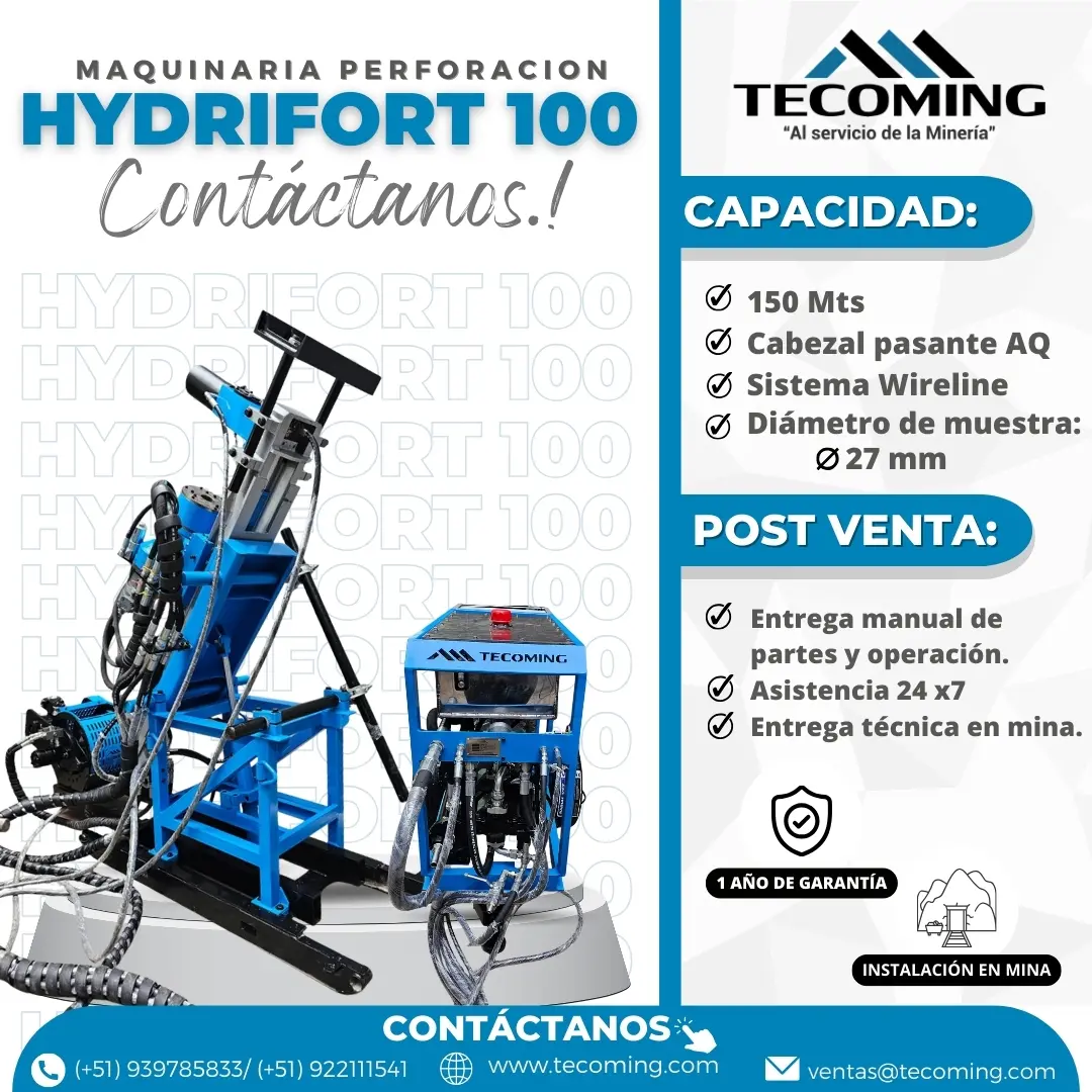 PERFORADORA HIDRÁULICA HYDRIFORT 100 Perforadora hidráulica versátil y compacta, diseñada para exploración minera en etapas iniciales o zonas de acceso restringido. Opera en dos líneas de perforación (AQ y BQ), ofreciendo flexibilidad, eficiencia y seguridad para campañas que requieren movilidad y adaptabilidad. CARACTERÍSTICAS TÉCNICAS Alcance línea AQ: Hasta 150 metros Alcance línea BQ: Hasta 70 metros Versatilidad para dos diámetros de perforación Sistema de operación segura para protección del operador Diseño compacto, ligero y portable Construcción robusta con componentes hidráulicos de calidad SERVICIO POST-VENTA Garantía de 1 año por defectos de fabricación Capacitación e instalación en mina por técnicos especializados Manual técnico y de partes incluido Stock de accesorios originales disponibles Asistencia virtual 24/7 con soporte técnico Contáctanos: WhatsApp / Celular: ( 51) 922 111 541 ( 51) 939 785 833 ( 51) 941 691 656 Teléfono fijo: (01) 480 5856 Correo: ventas@tecoming.com Web: www.tecoming.com YouTube: https://www.youtube.com/watch?v=TQklY3gSTI4 #MiningSolutions #MiningIndustry #GeologicalEquipment #ExplorationTools #CoreSampleTrays #GeologicalTrays #CoreStorage #MiningSamples