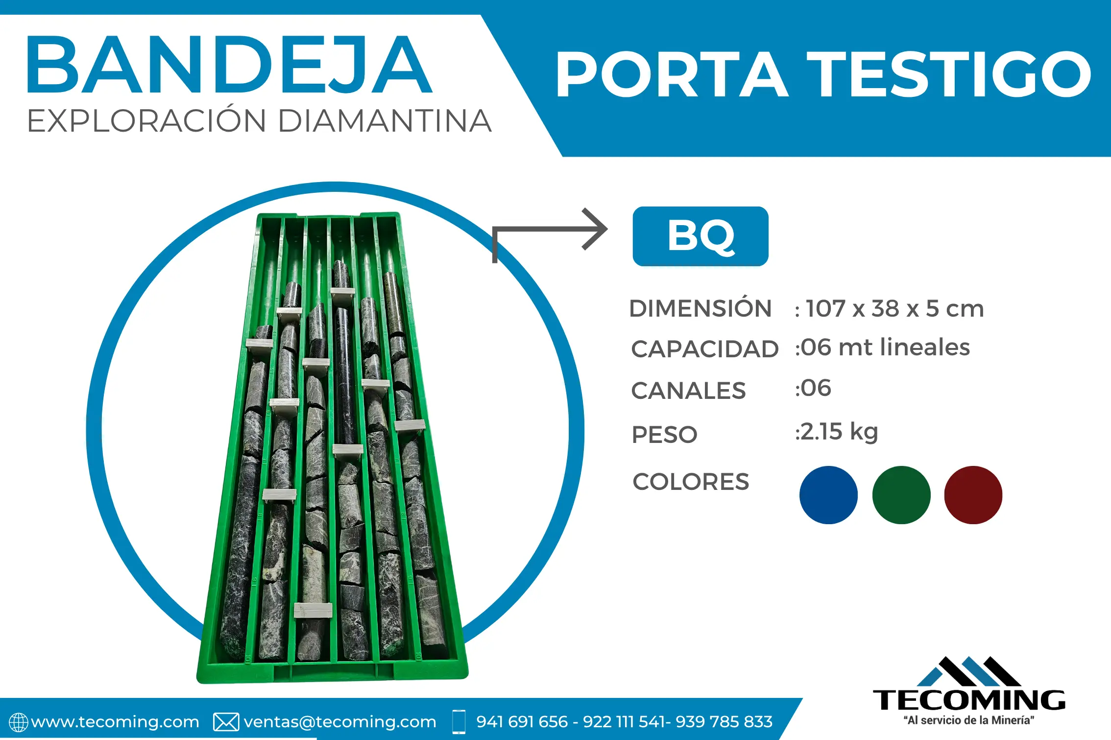 Producto para geología, diseñado para el registro de muestras y testigos obtenidos de la perforación diamantina. Caracteristicas -Material: Plástico PP. -Modelo: BQ -Capacidad: 6 metros lineales -Proceso: Inyección -Personalizado: Color y etiquetas. También contamos con las tapas y separadores/tacos y complementos de las bandejas porta testigo. Contáctanos en: WhatsApp-celular: ( 51)-922111541 ( 51) 939785833 ( 51) 941691656 Teléfono: (511) 4805856 E-mail: ventas@tecoming.com Web: https://tecoming.com